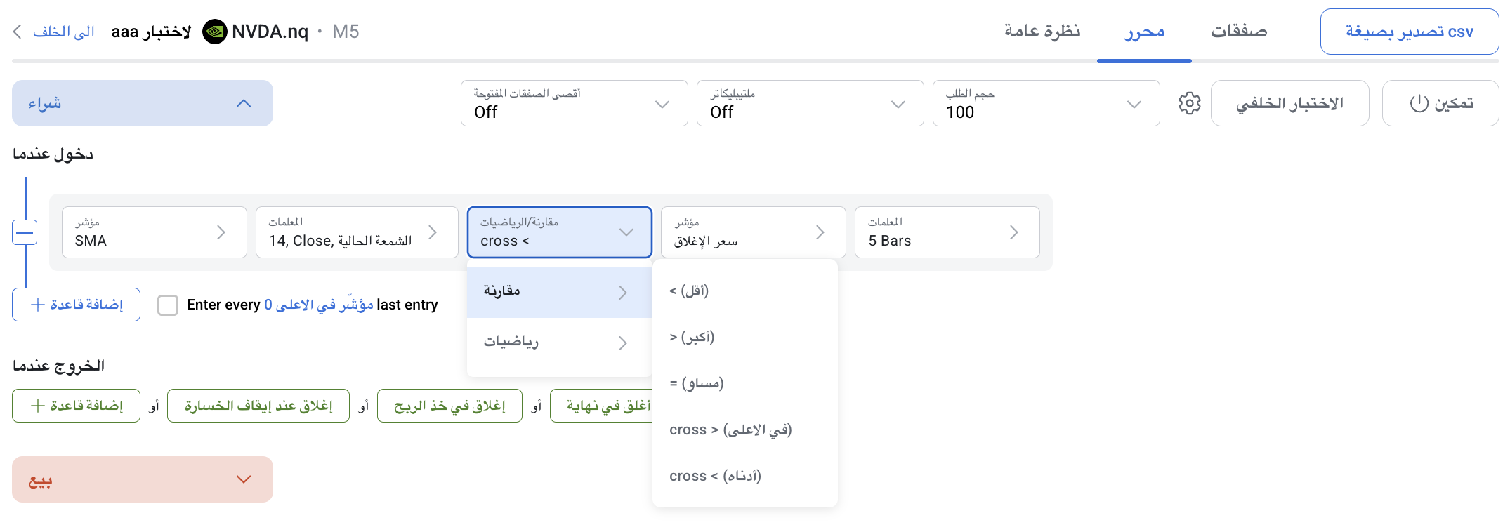 < (أقل): صحيحة إذا كانت القيمة الأولى أقل من القيمة الثانية> (أكبر): صحيحة إذا كانت القيمة الأولى أكبر من القيمة الثانية= (مساو): صحيحة إذا كانت القيمة الأولى مساوية للقيمة الثانية> (في الاعلى): صحيحة مرة واحدة فقط بعد أن تصبح القيمة الأولى أكبر من القيمة الثانية< (أدناه): صحيحة مرة واحدة فقط بعد أن تصبح القيمة الأولى أقل من القيمة الثانية