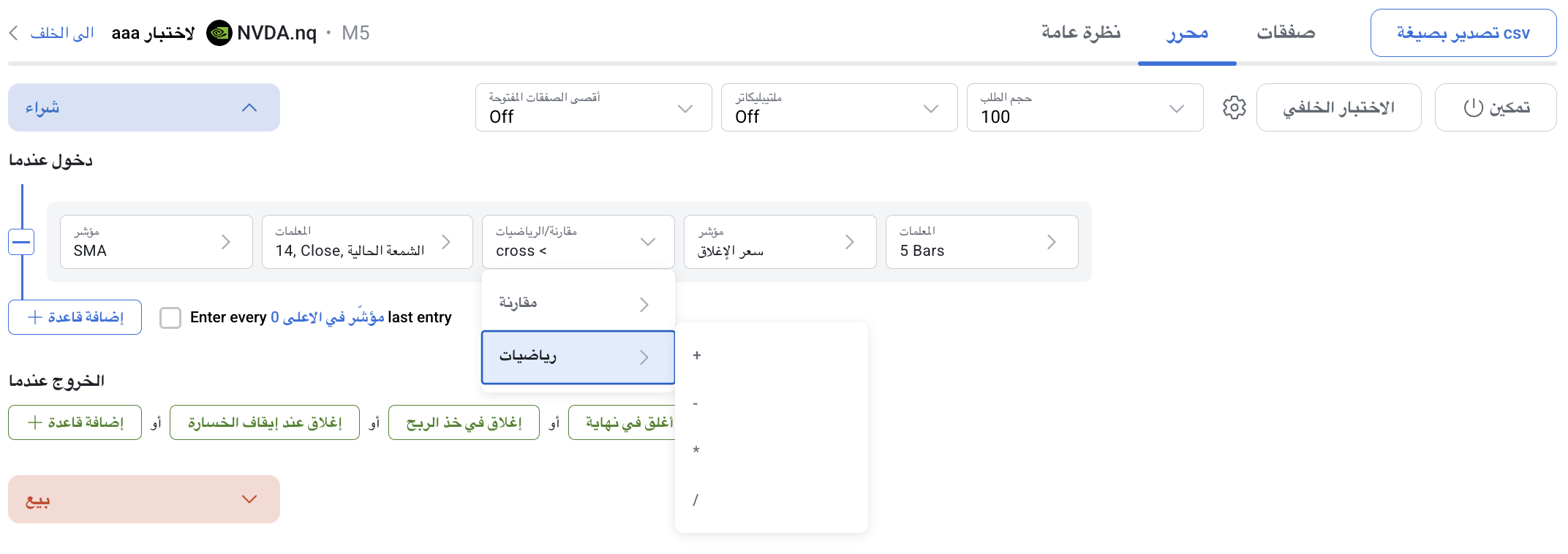 تقارن القاعدة دائما قيمة واحدة مع الأخرى. يمكن أن تكون القيمة نتيجة للمؤشر الفني المحسوب أو مجرد رقم (في حال كان المؤشر هو القيمة). يمكنك استخدام عمليات الرياضيات الأساسية مع قيمتين وقارن النتيجة مع قيمة أخرى.