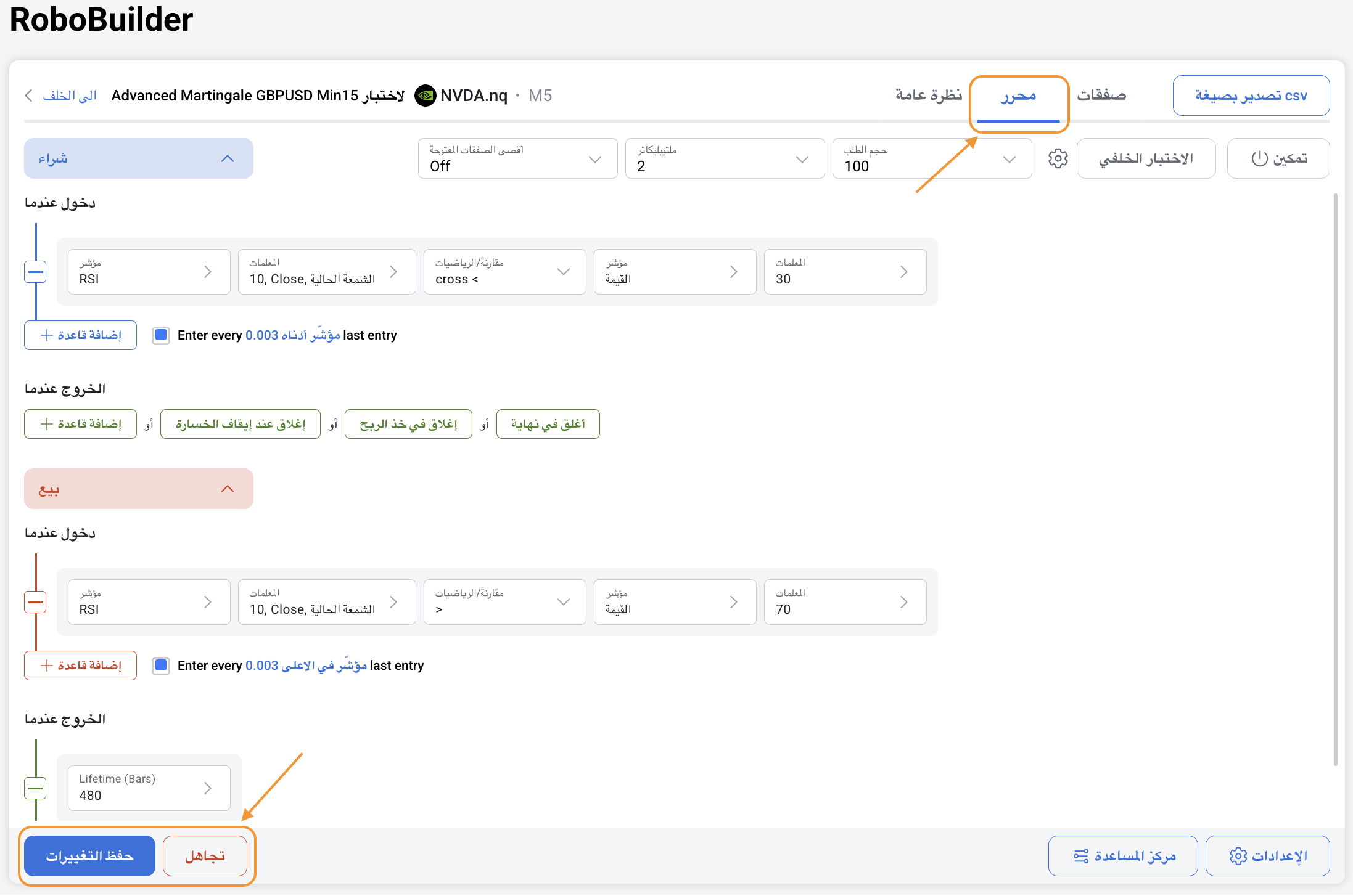 في الزاوية اليمنى السفلى من تبويب المحرر يوجد زران: تجاهل وحفظ التغييرات.