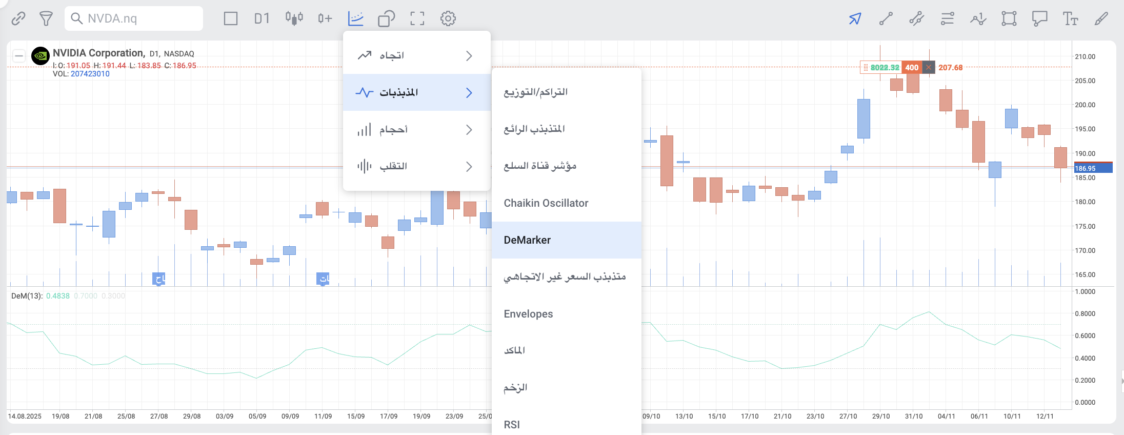 بعد حساب DeMax وDeMin، يتم إدخالهما في صيغة DeMarker الخاصة بالمؤشر للحصول على القراءة النهائية للمؤشر.