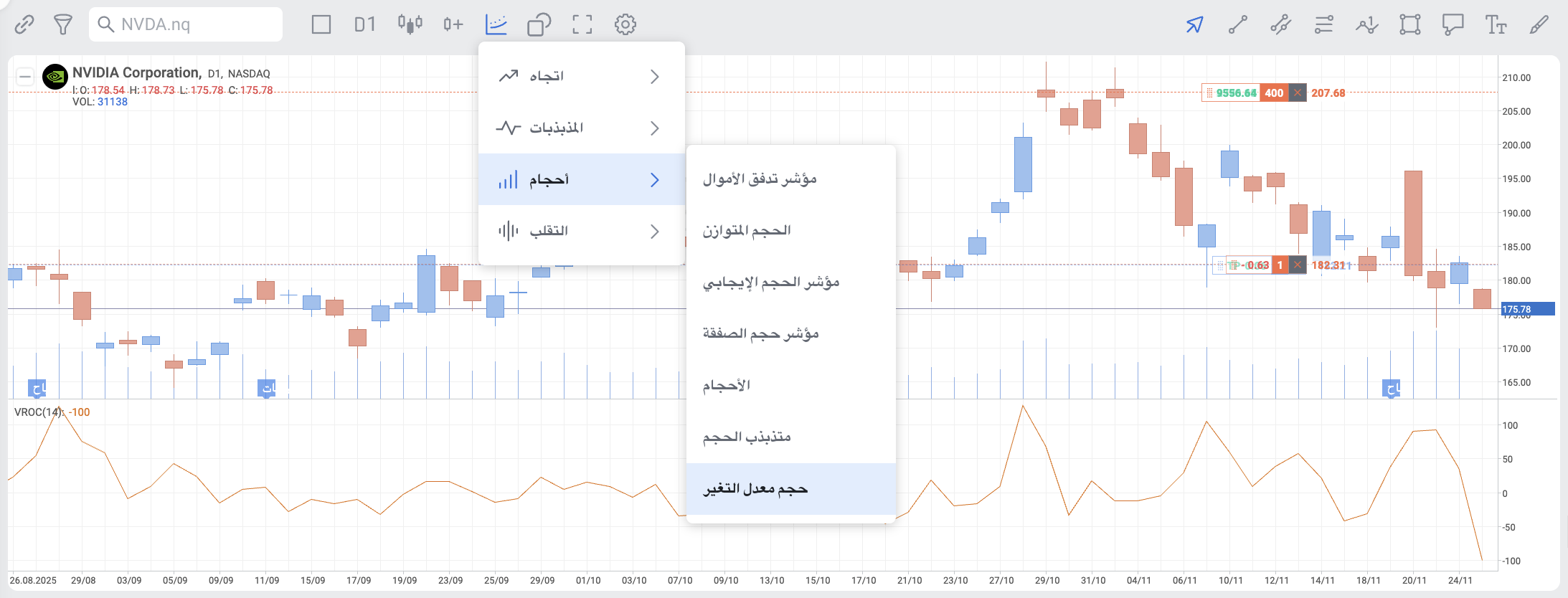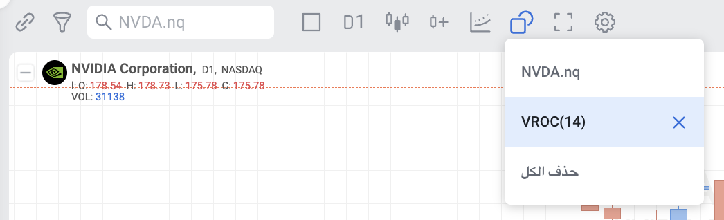 المعنى: إذا كان حجم التداول اليوم أعلى من n يومًا (أو أسبوعًا/شهرًا) مضت، ستكون نسبة التغير موجبة. إذا كان الحجم أقل، سيكون V-ROC سالبًا. يتيح لنا ذلك مراقبة سرعة تغير الحجم.