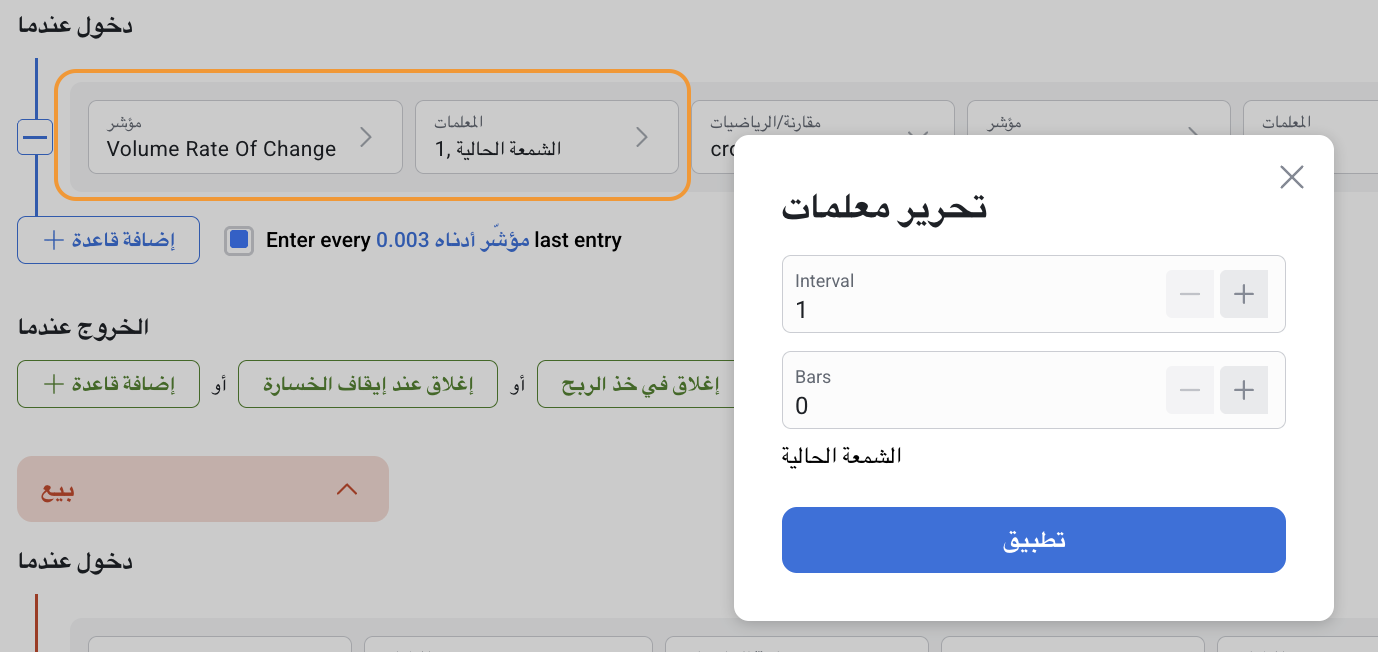 يمكن استخدام معدل تغير الحجم (V-ROC) بشكل منفصل أو مع مؤشرات أخرى في RoboBuilder.