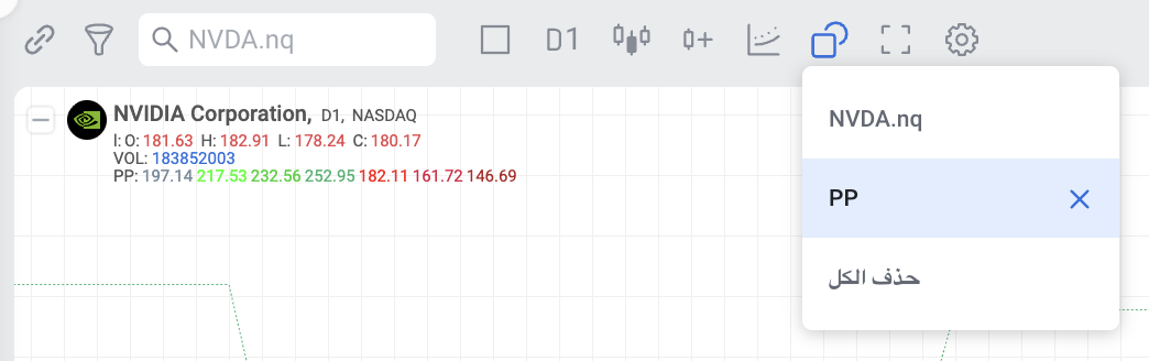 يمكن إضافة مؤشر Pivot Point مباشرة إلى الرسم البياني، وسيتم حساب المستويات وعرضها تلقائيًا. ومع ذلك، يمكن حسابها يدويًا أيضًا. تُستخدم نقاط المحور غالبًا من قبل المتداولين اليوميين، وهي تعتمد على قيم الارتفاع والانخفاض والإغلاق ليوم التداول السابق.