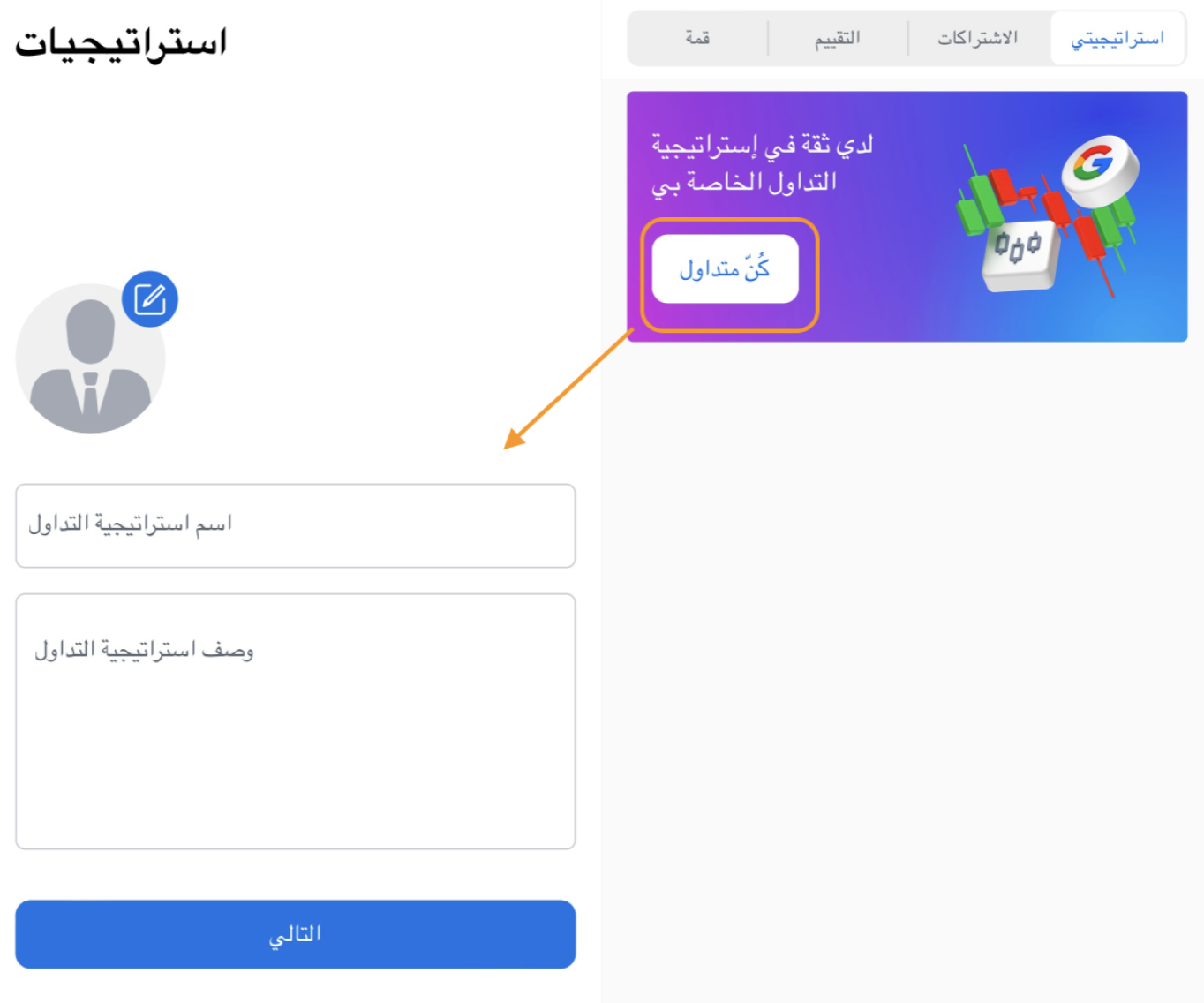 1.يحتاج المتداول إلى إنشاء استراتيجية جديدة في تطبيق StocksTrader باستخدام أداة Copy Trading المدمجة