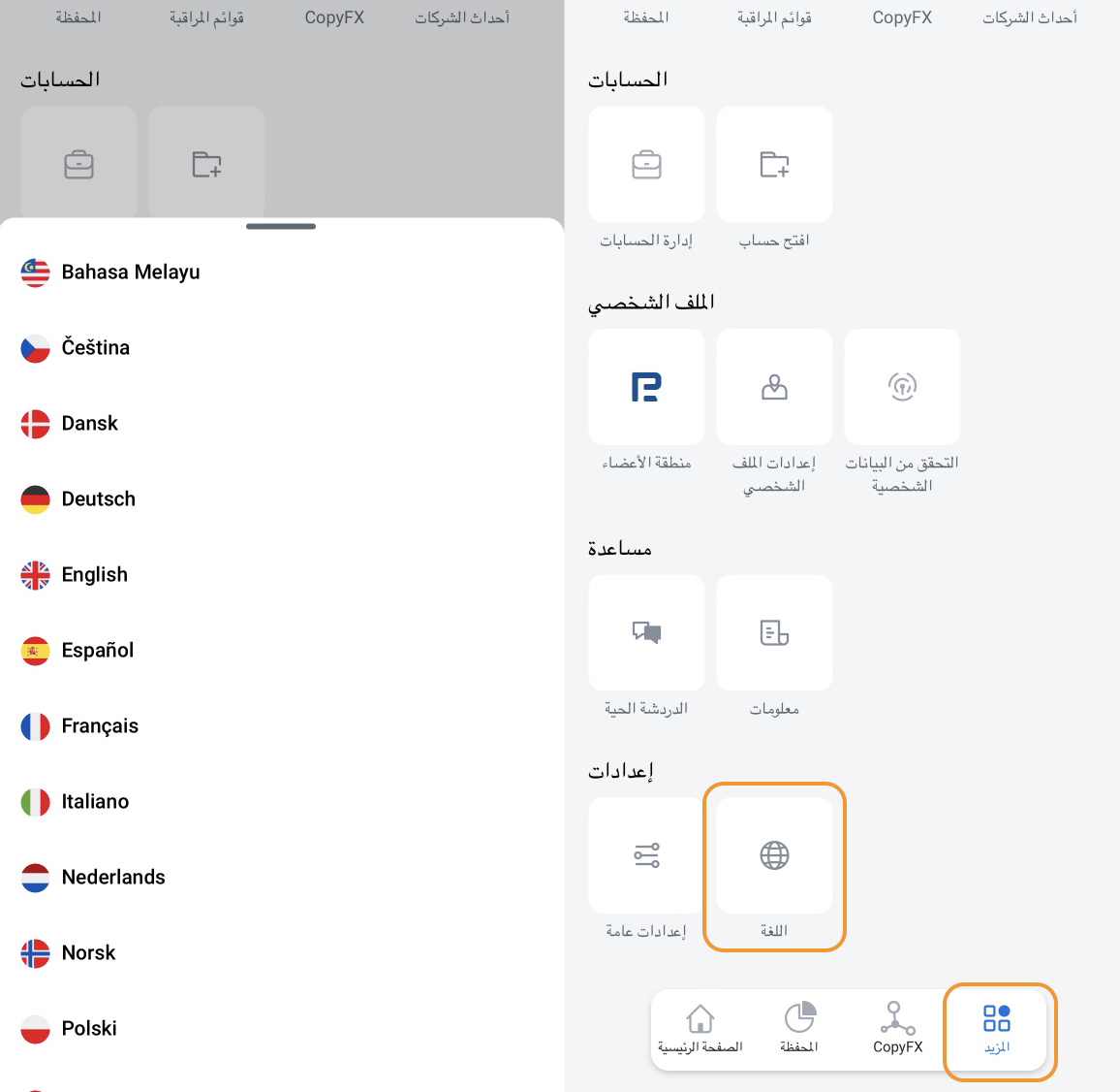 لتغيير اللغة، اذهب إلى المزيد > الإعدادات > اللغة. اختر من بين 21 لغة للتنقل في التطبيق.