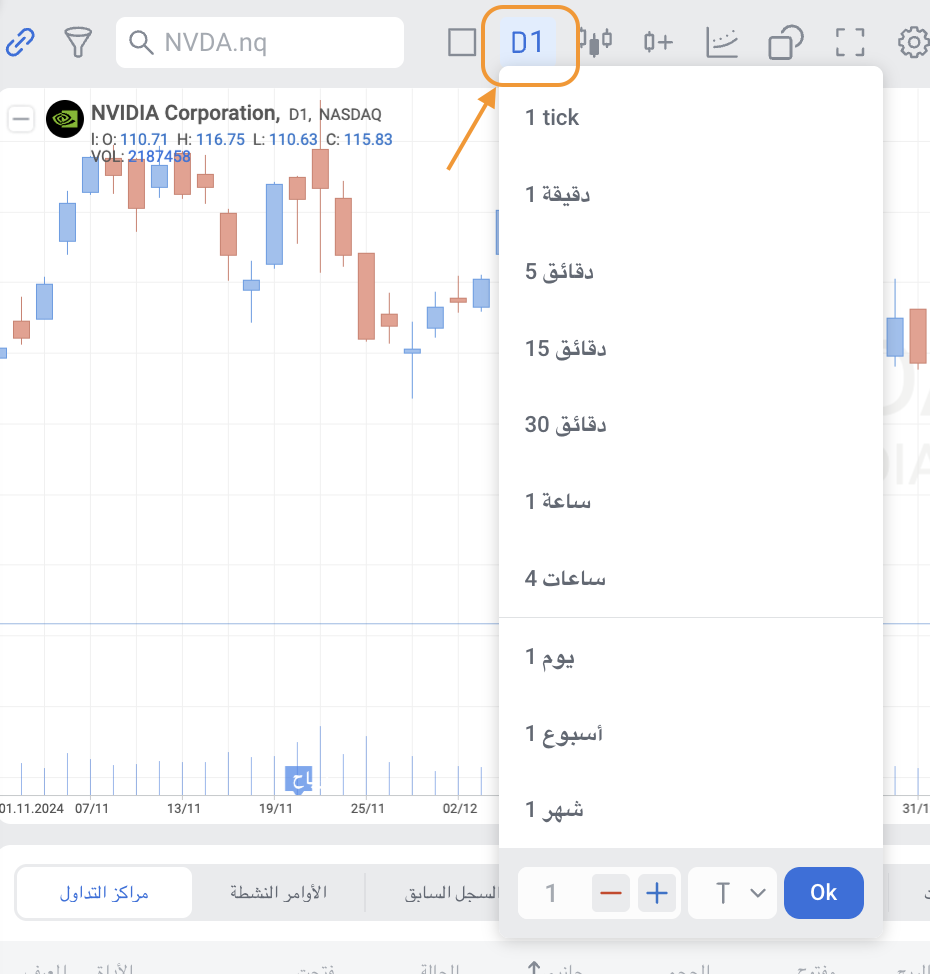 - تخصيص الرسم البياني وفقًا لاستراتيجيتك – قم بضبط الفواصل الزمنية لرؤية تحركات الأسعار بشكل أوضح.