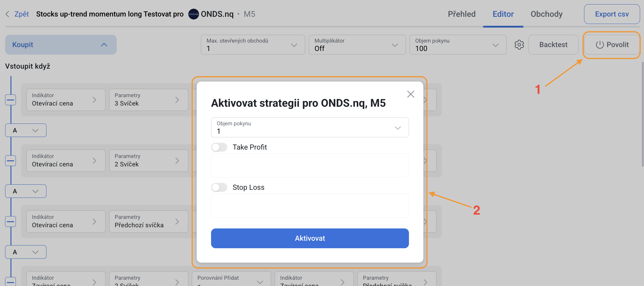 Chcete-li strategii povolit, otevřete konkrétní strategii a klikněte na tlačítko Povolit. Ujistěte se, že aktivujete strategii pro požadovaný instrument a časový rámec. To si můžete zkontrolovat v záhlaví vyskakovacího okna.