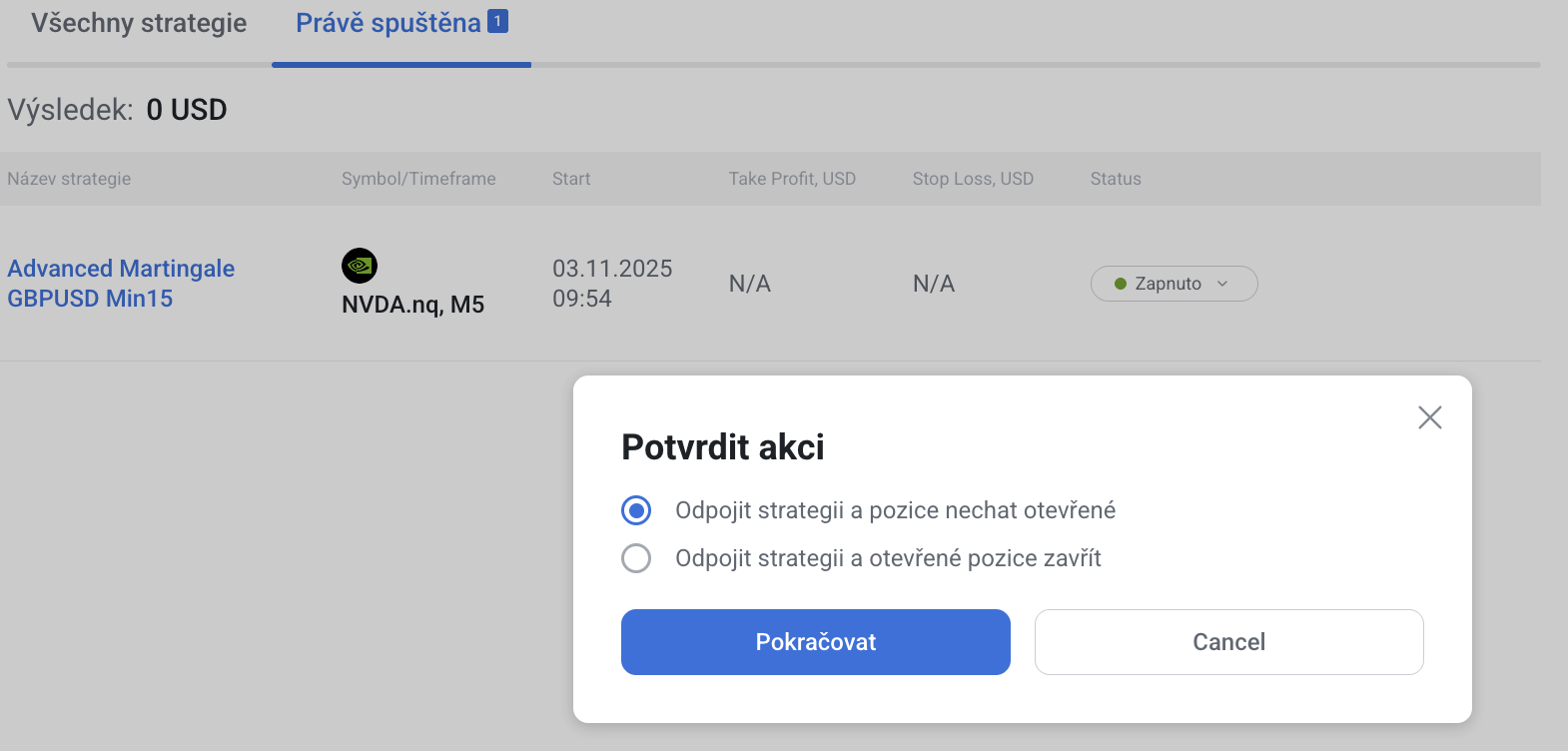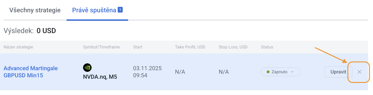 Pro zrušení spuštěné strategie klikněte na ikonu křížku v seznamu spuštěných strategií.