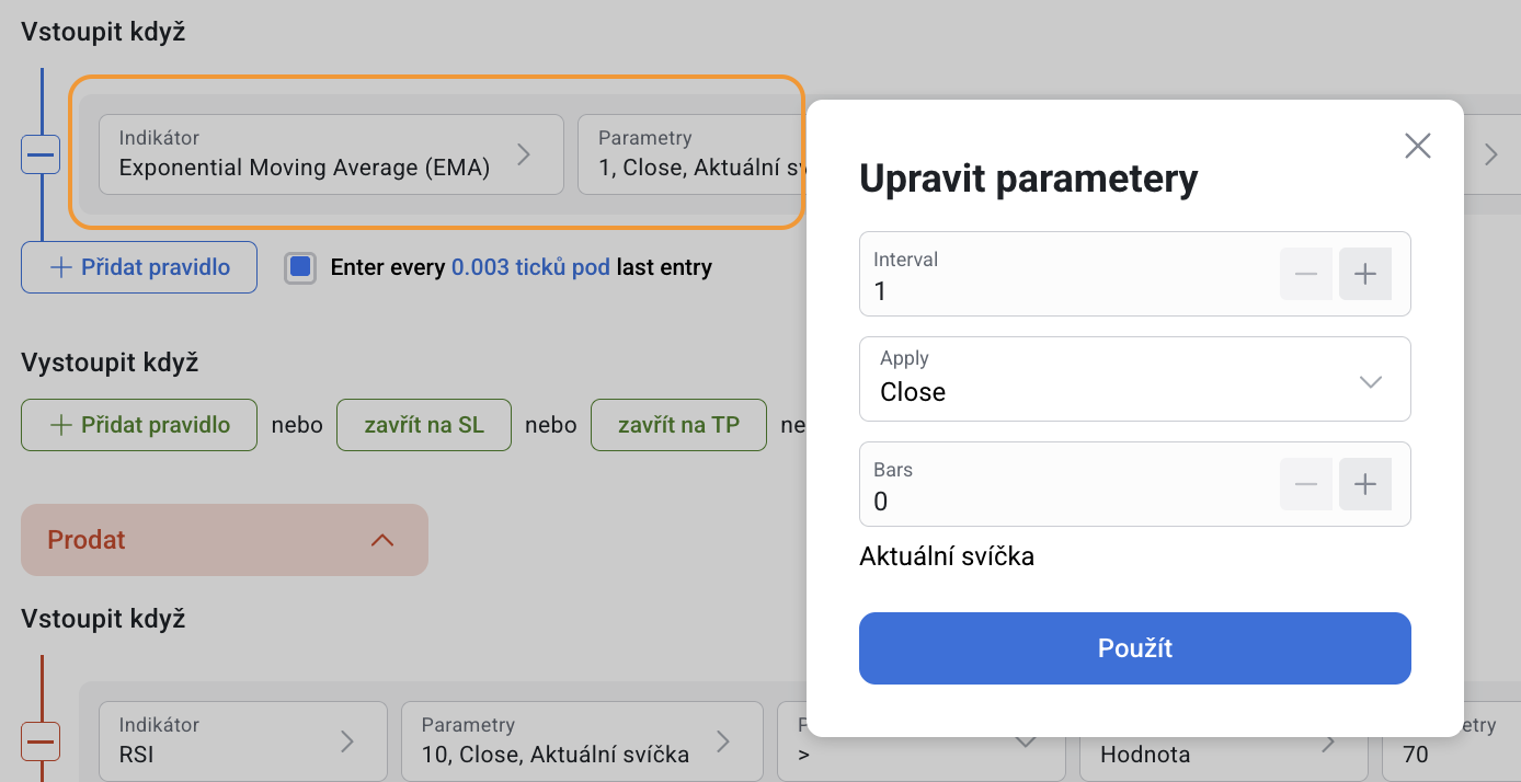 Klouzavý průměr (ЕМА, SMA) lze použít jak samostatně, tak společně s dalšími indikátory v nástroji pro tvorbu strategií.