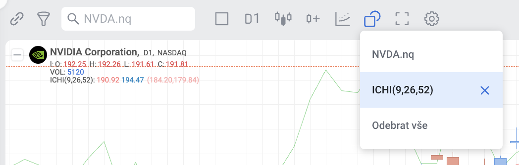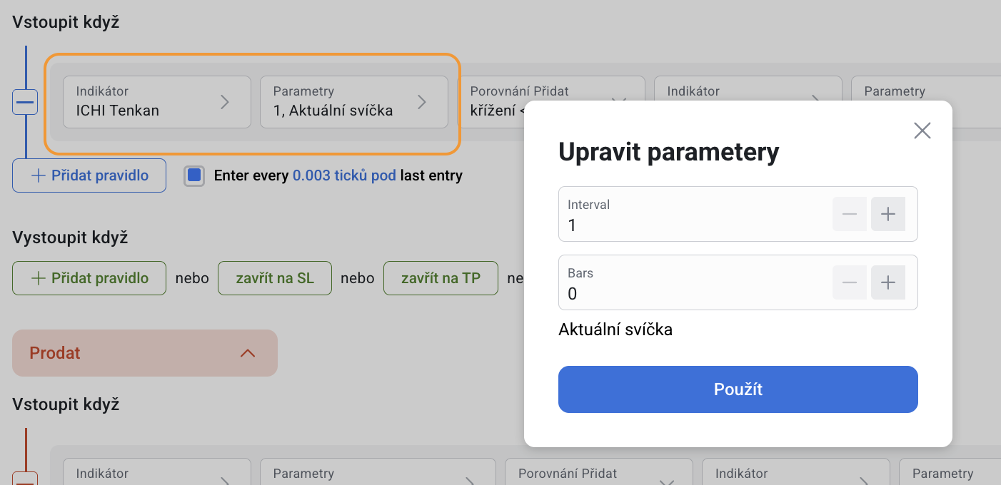 Vzhledem k tomu, že indikátor Ichimoku Kinko Hyo se skládá ze tří samostatných složek (Tenkan, Kijun, Chinkou), z nichž každá má své vlastní parametry a hodnoty, je v nástroji pro tvorbu strategií indikátor Ichimoku Kinko Hyo také rozdělen na tři indikátory:
