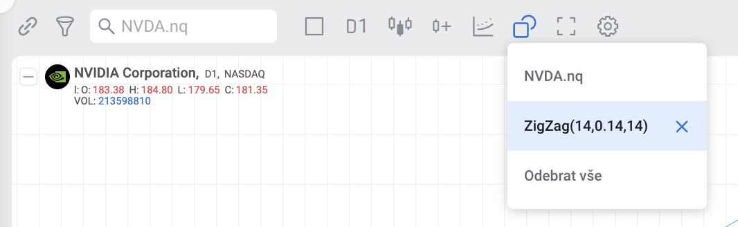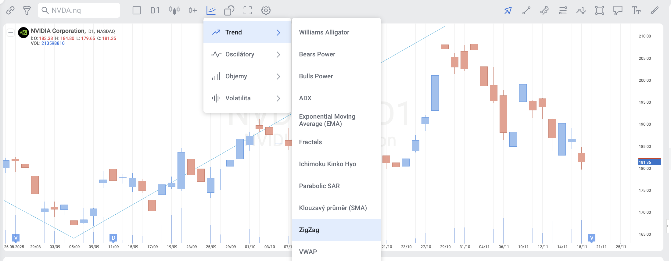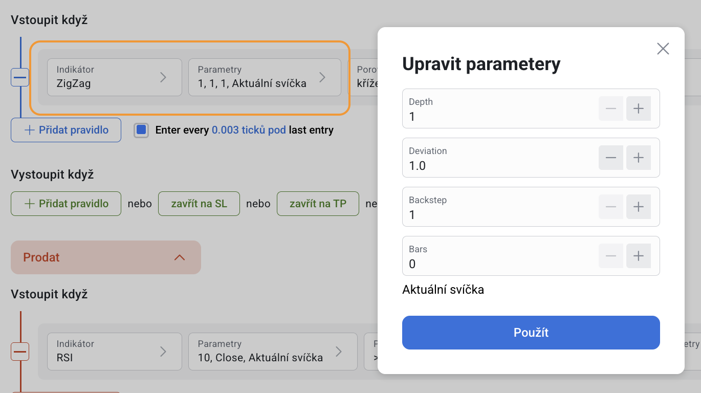 ZigZag lze použít jak samostatně, tak společně s dalšími indikátory v nástroji pro tvorbu strategií.