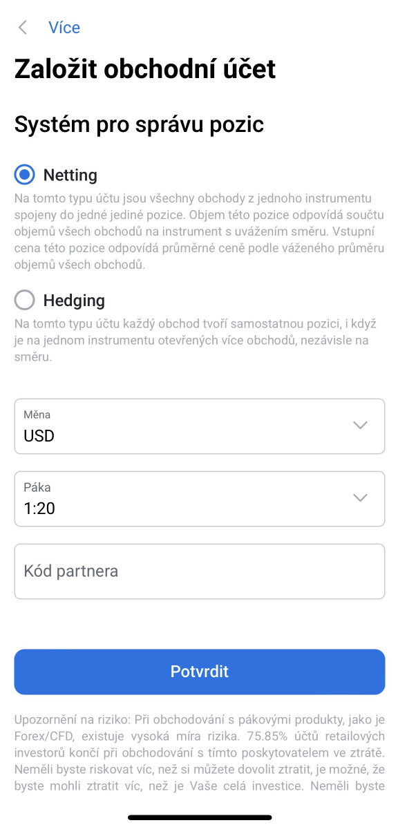 2. Otevřete si nový účet se systémem hedging nebo použijte již existující účet StocksTrader.