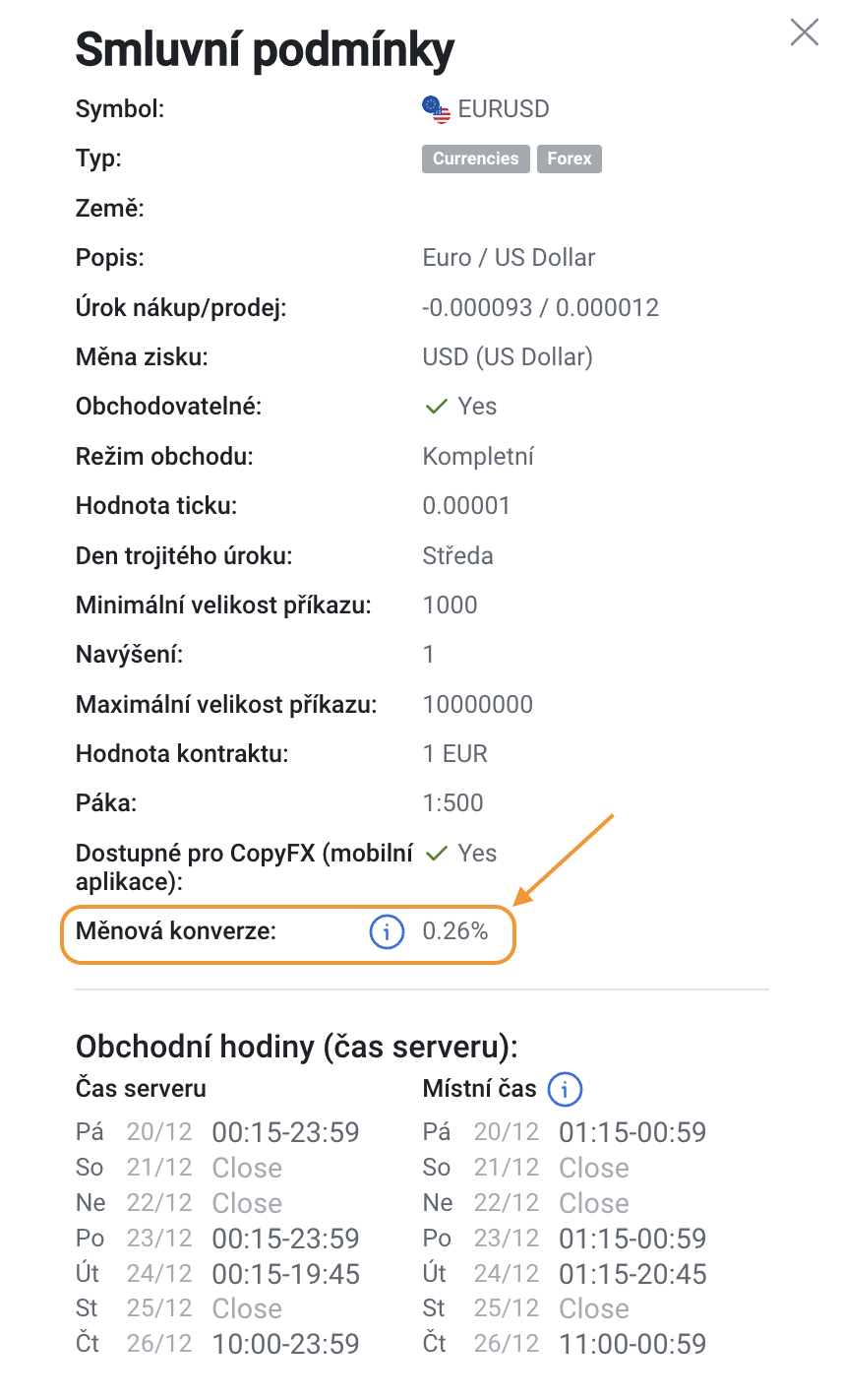Přirážky se aplikují na přepočítací koeficienty v případě, že je třeba převést fondy zapojené do obchodování s akciemi, ETF a CFD. Hodnoty přirážek použité pro převod prostředků pro každý měnový pár si prohlédněte v části „Smluvní podmínky“.