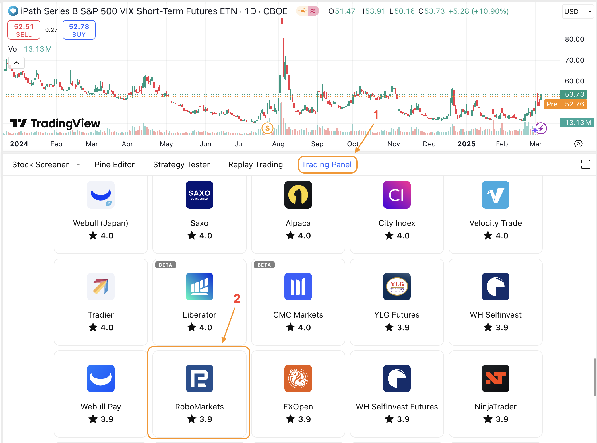 1. Přejděte na TradingView. Otevřete TradingView a v Trading Panel vyberte RoboMarkets.