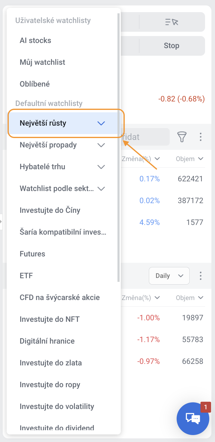 Sekci „Největší růsty“ najdete v pravém menu webové platformy StocksTrader, hned pod tlačítky Prodat a Koupit. Chcete-li ji otevřít, klikněte na aktuální seznam sledovaných položek a ze seznamu výchozích seznamů sledovaných položek vyberte možnost Největší růsty.
