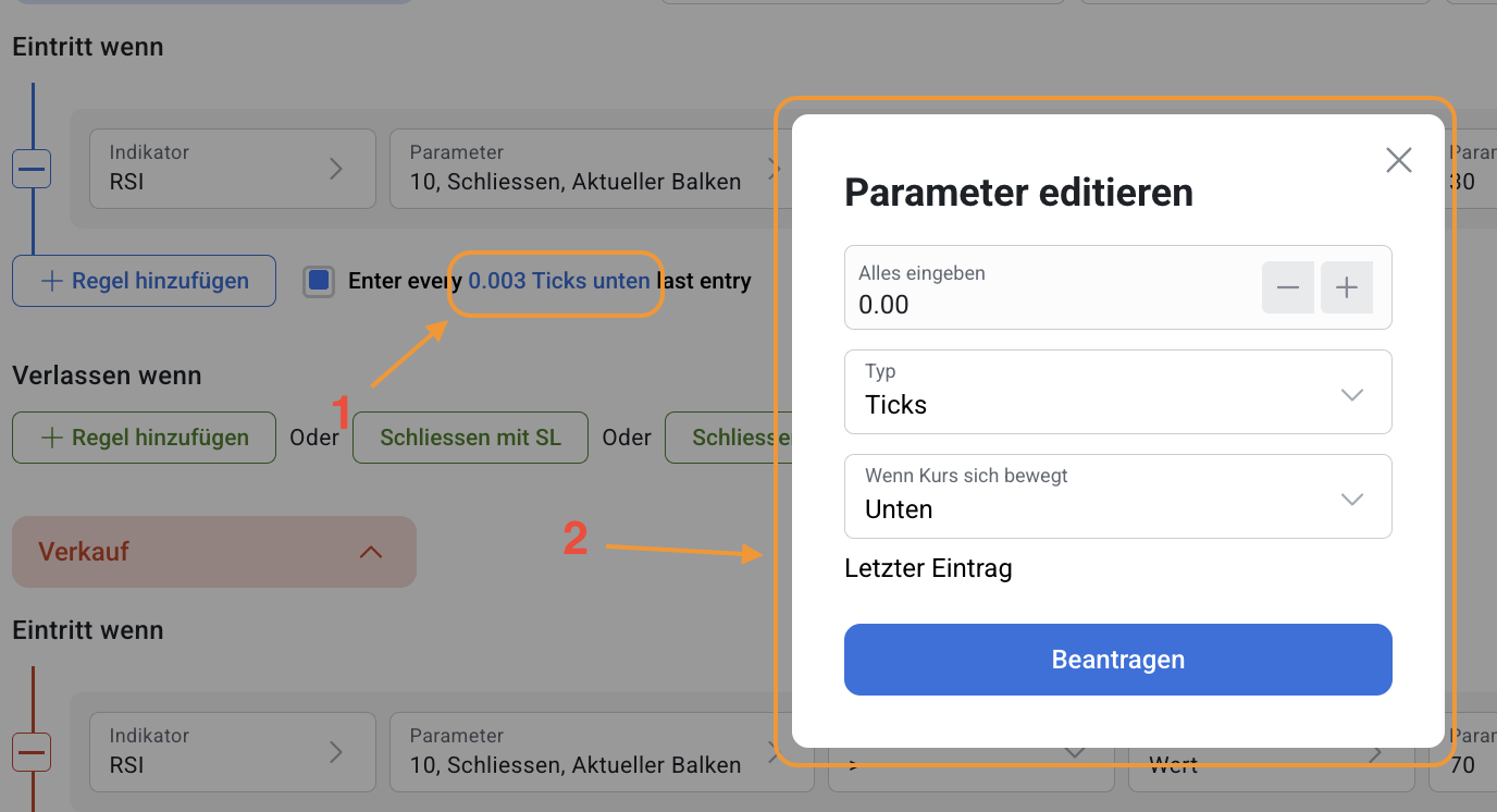 Wenn diese Option aktiviert ist, wird der nächste Trade N Ticks über oder unter dem Eröffnungspreis des letzten Trades eröffnet (gemäß den Einstiegskriterien).