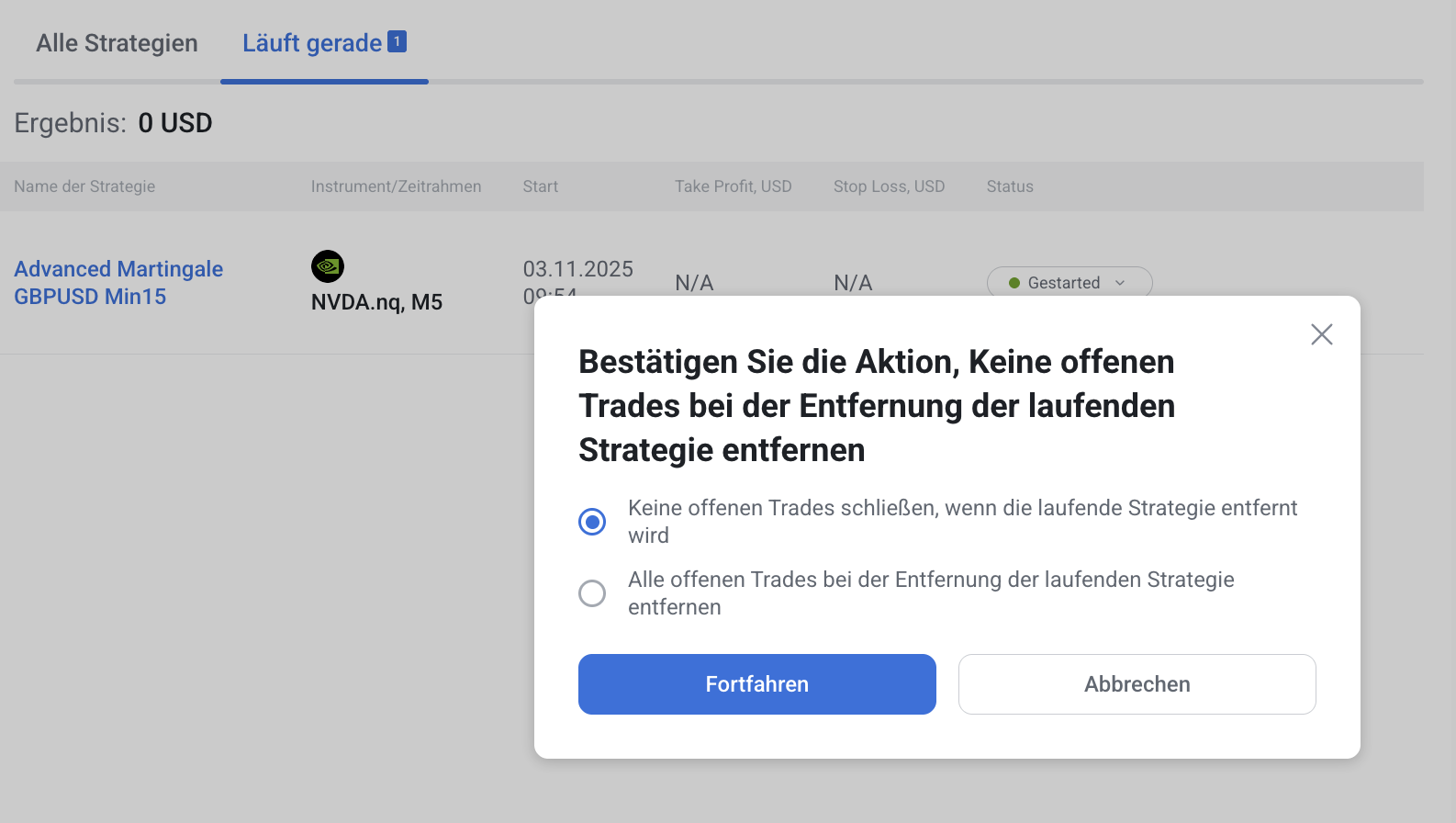 Beim Entfernen der Strategie kann der Benutzer auswählen, ob alle offenen Positionen der Strategie geschlossen werden sollen oder nicht.