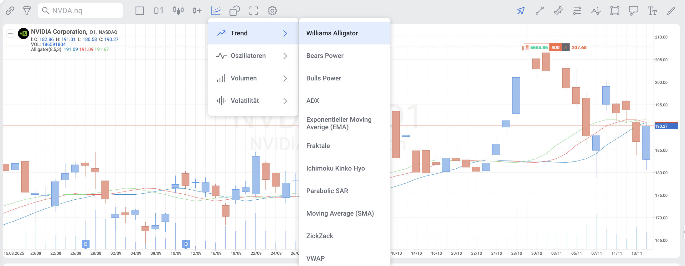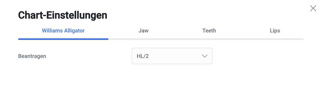Er nutzt drei gleitende Durchschnitte mit 5, 8 und 13 Perioden. Diese entsprechen dem Kiefer (Jaw), den Zähnen (Teeth) und den Lippen (Lips) des Alligators.