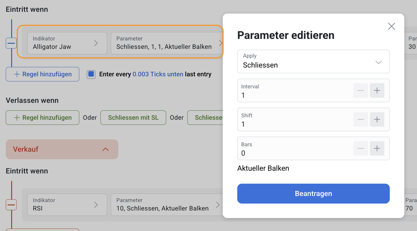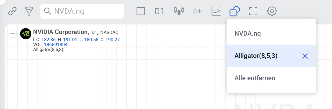 Da der Williams-Alligator-Indikator aus drei separaten Komponenten besteht (Alligator Jaw, Alligator Teeth, Alligator Lips), die jeweils eigene Parameter und Werte besitzen, ist er auch im RoboBuilder in drei einzelne Indikatoren unterteilt: