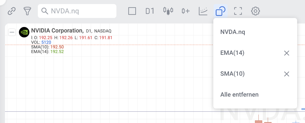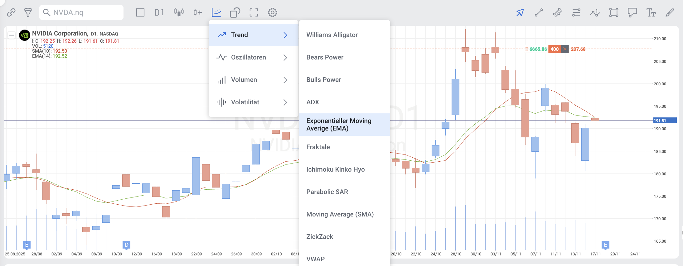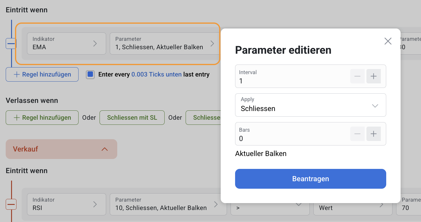 Gleitende Durchschnitte (EMA, SMA) können sowohl einzeln als auch zusammen mit anderen Indikatoren im RoboBuilder verwendet werden.