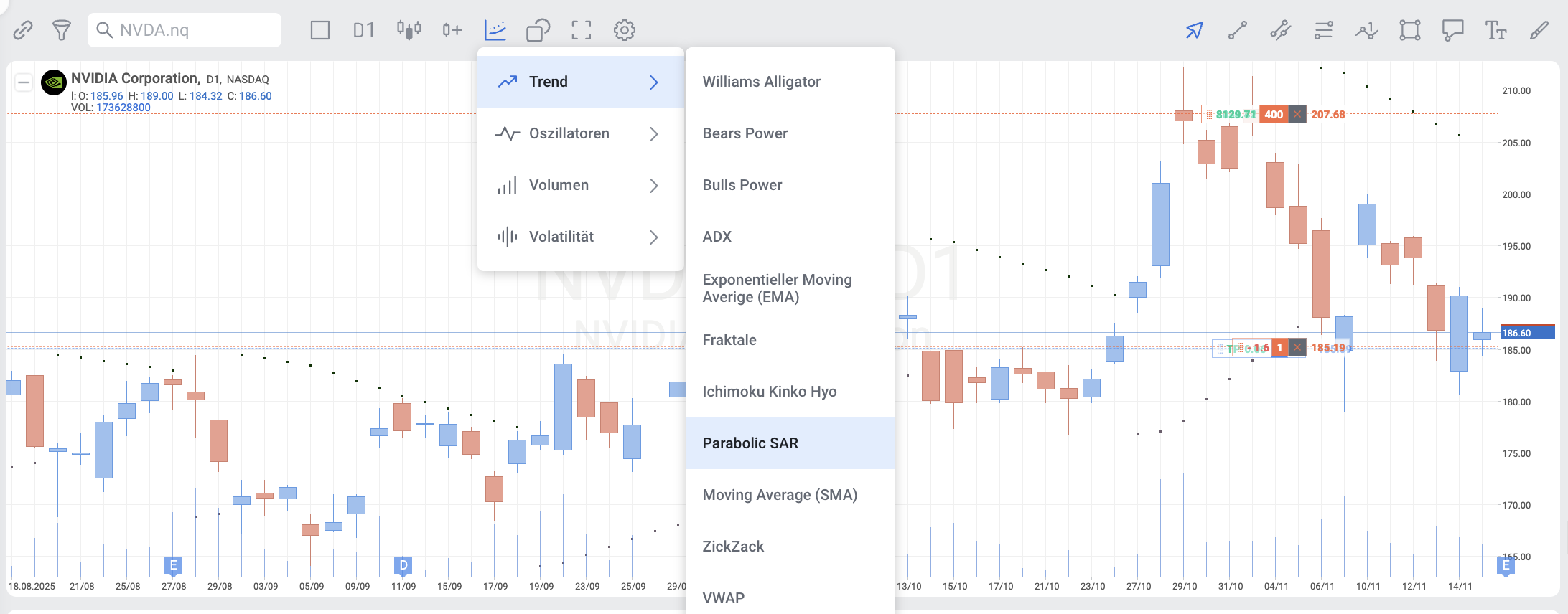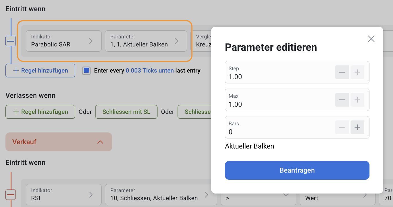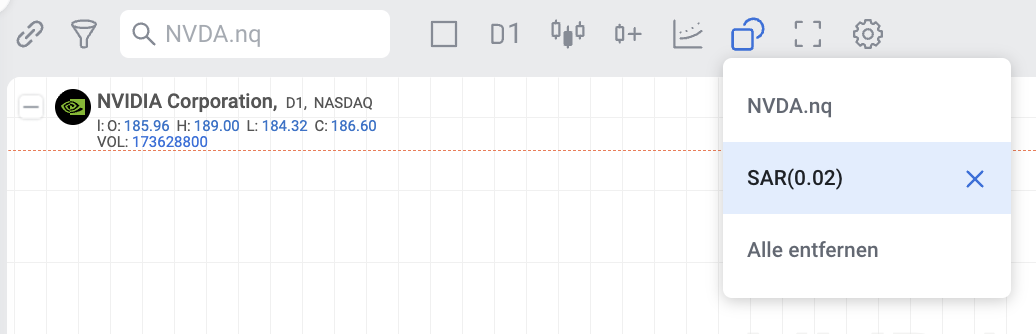 Parabolic SAR kann sowohl separat als auch zusammen mit anderen Indikatoren im RoboBuilder verwendet werden.