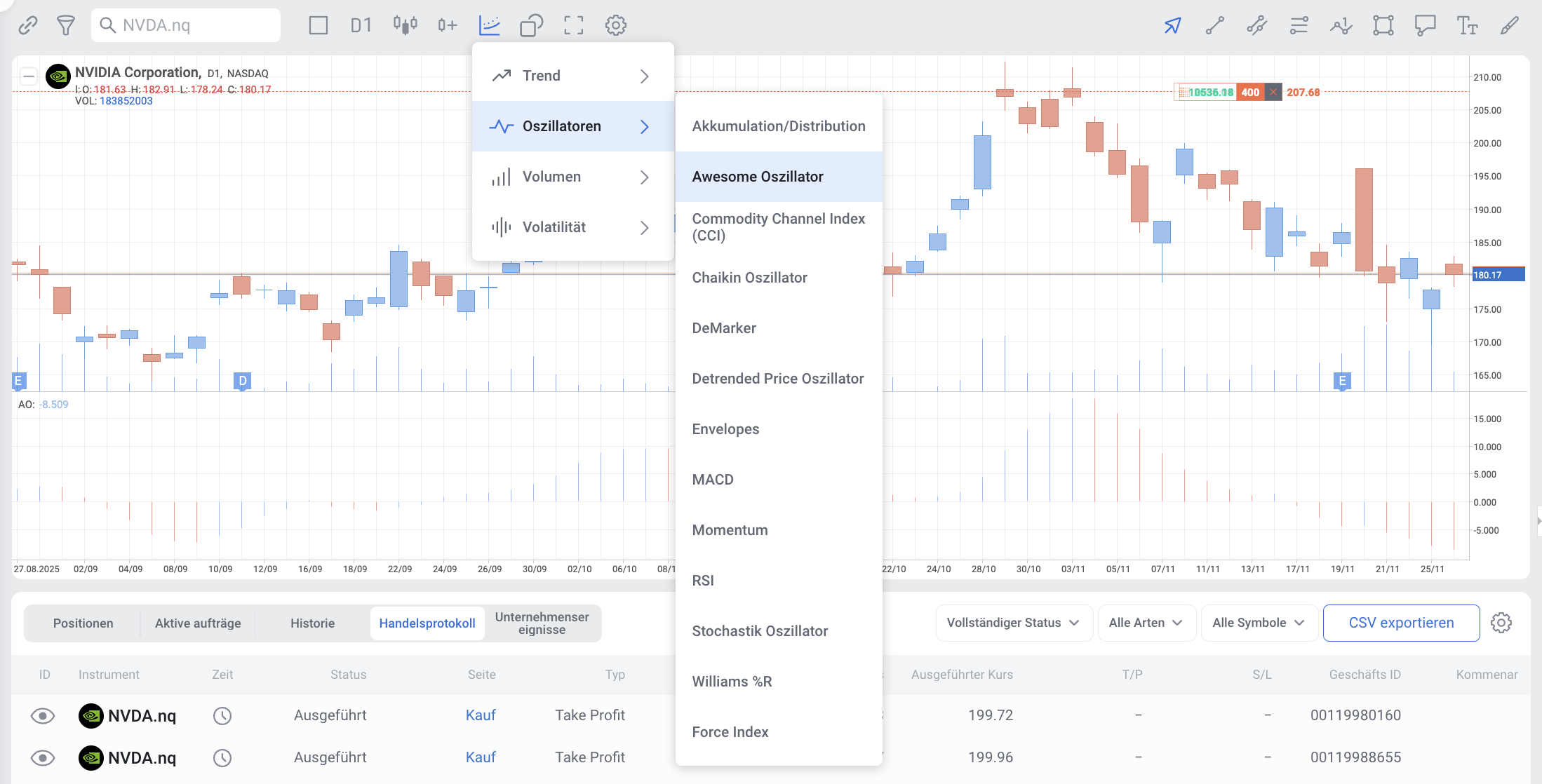 AwesomeOscillator=SMA(Medianpreis,5Perioden)−SMA(Medianpreis,34Perioden)Awesome Oscillator = SMA(\text{Medianpreis}, 5 Perioden) - SMA(\text{Medianpreis}, 34 Perioden)AwesomeOscillator=SMA(Medianpreis,5Perioden)−SMA(Medianpreis,34Perioden)