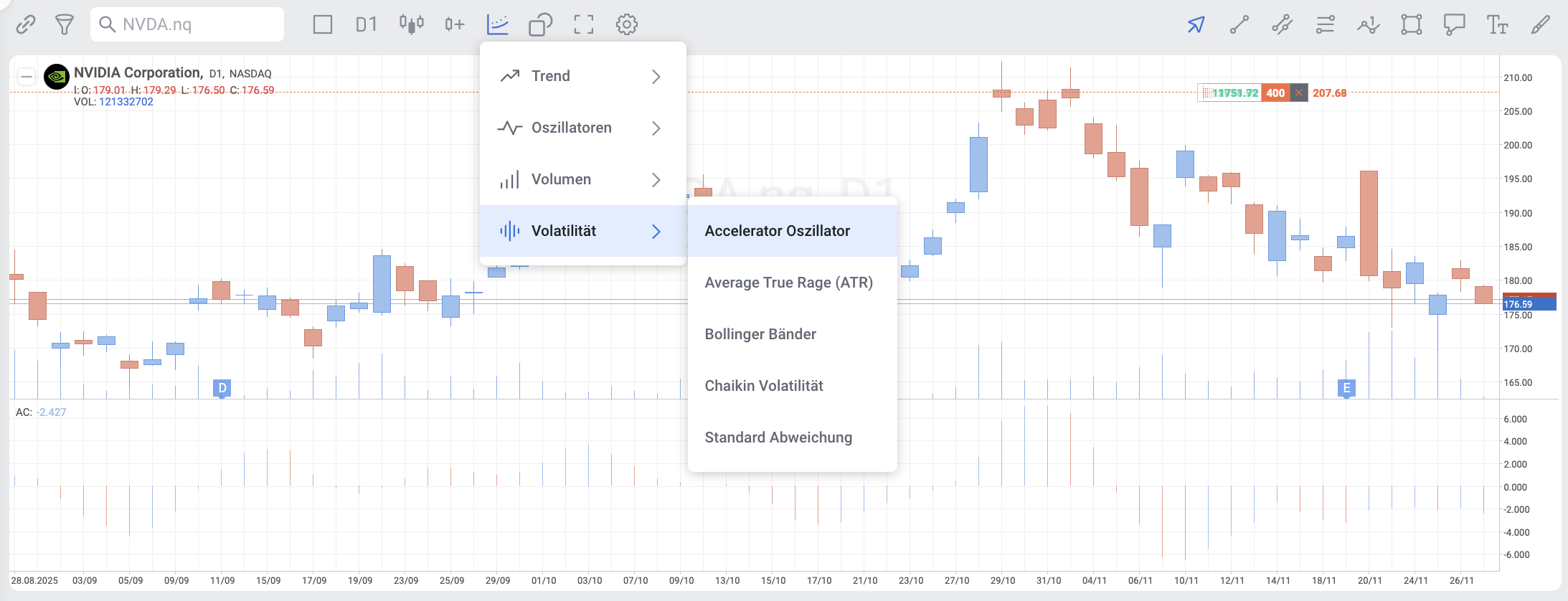 Der Acceleration/Deceleration Indicator (AC) misst die Beschleunigung und Verzögerung der aktuellen Marktkraft, indem er Änderungen der Momentum-Beschleunigung erfasst. Die Richtung dieses Indikators ändert sich stets früher als der Preis. Das bedeutet, dass das Beobachten des Momentum-Indikators statt ausschließlich des Preises einen Vorteil beim Timing bietet. Ziel des Acceleration Oscillators ist es, frühe Veränderungen im Momentum zu erkennen – also Momente, in denen das Momentum entweder beschleunigt oder verzögert.