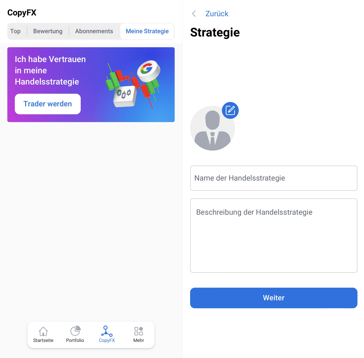 1. Ein Trader muss eine neue Strategie in der StocksTrader-App mit Hilfe der integrierten Funktion Copy Trading erstellen.