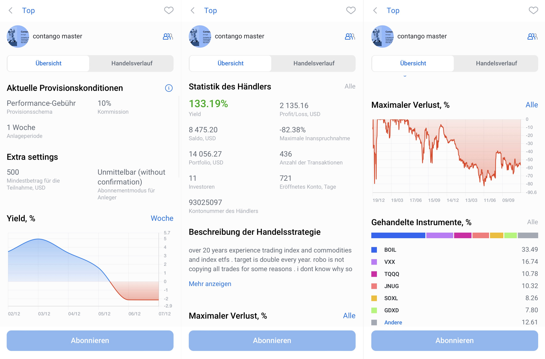 Die Anleger können die Performance der Strategie und die Provisionsbedingungen einsehen, bevor sie die Strategie eines Traders abonnieren.