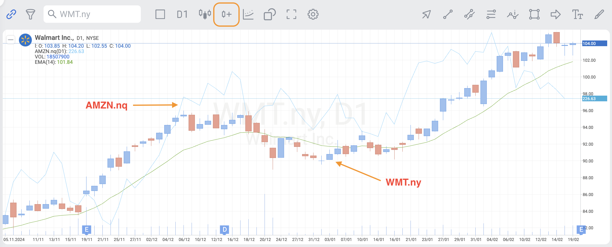 6. Fügen Sie dem aktuellen Chart ein neues Instrument hinzu, um die Dynamik zu vergleichen.