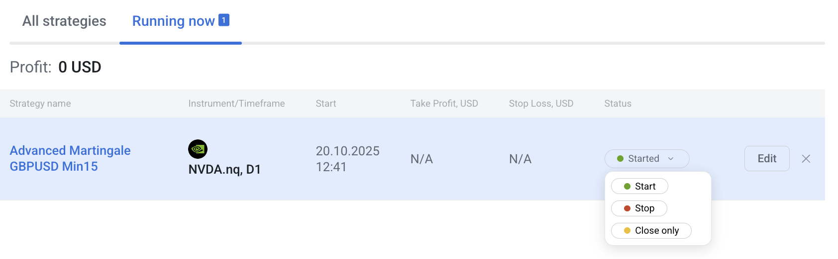 To see the list of running strategies go to the Running now tab. This tab indicates the list of instances.