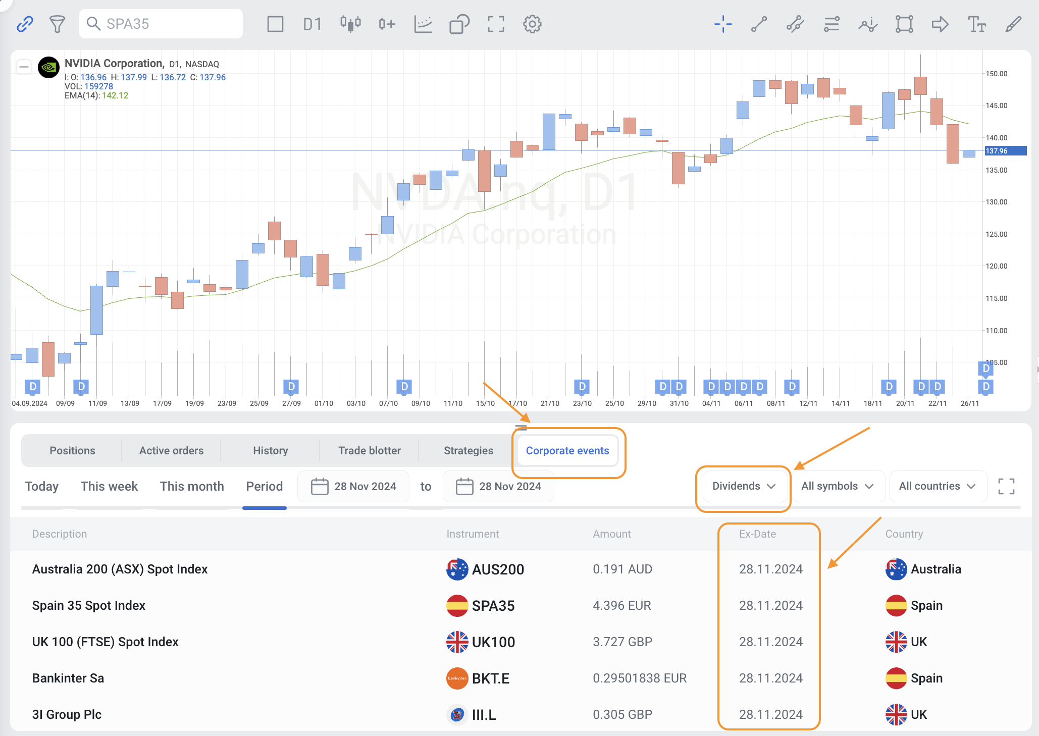 View the schedule of the "ex-dividend" dates for the upcoming future in the "Corporate events" section of your trading platform.