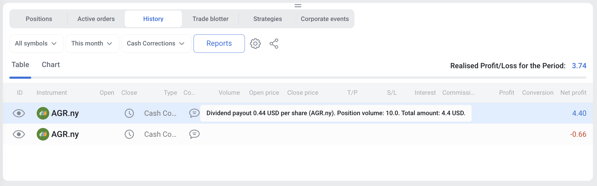 - A client holding a long position on the ex-dividend date will receive the applicable dividend in the form of a cash adjustment credited to the relevant trading account. Find the transaction in the History Tab on the client’s trading platform under "Cash Corrections".