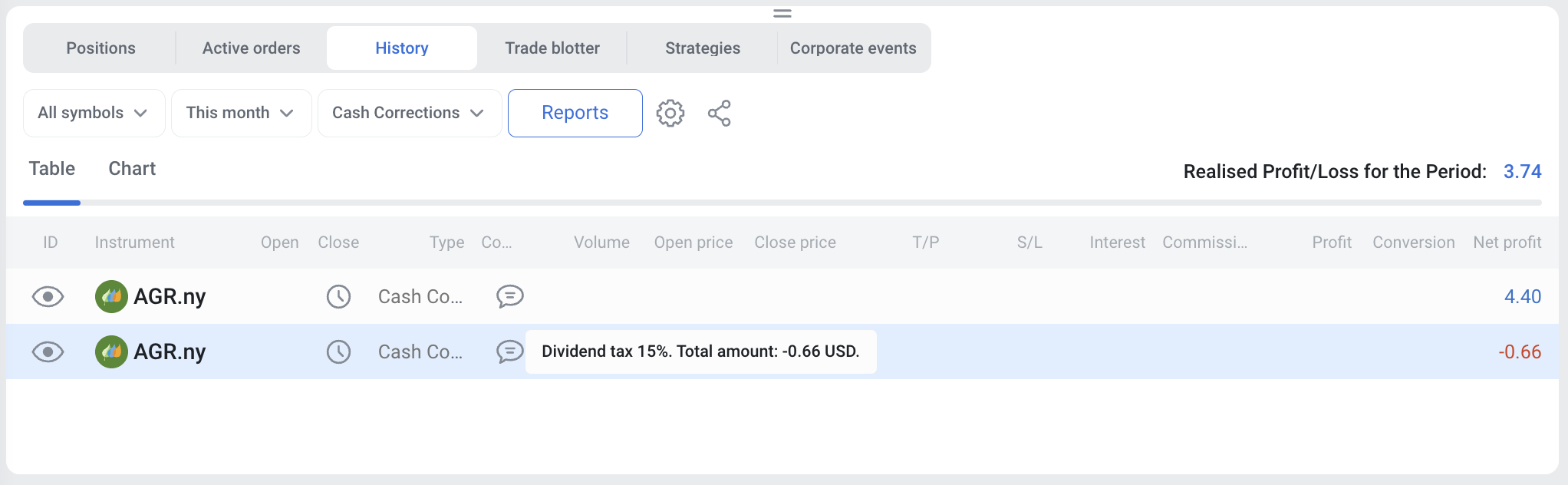 If you receive dividends from stocks, ETFs, or CFDs on stocks and ETFs in the US stock market, a 15% tax will be deducted. This amount will be taken from your account and marked as 'Dividend tax'. No dividend tax is withheld for European stocks.