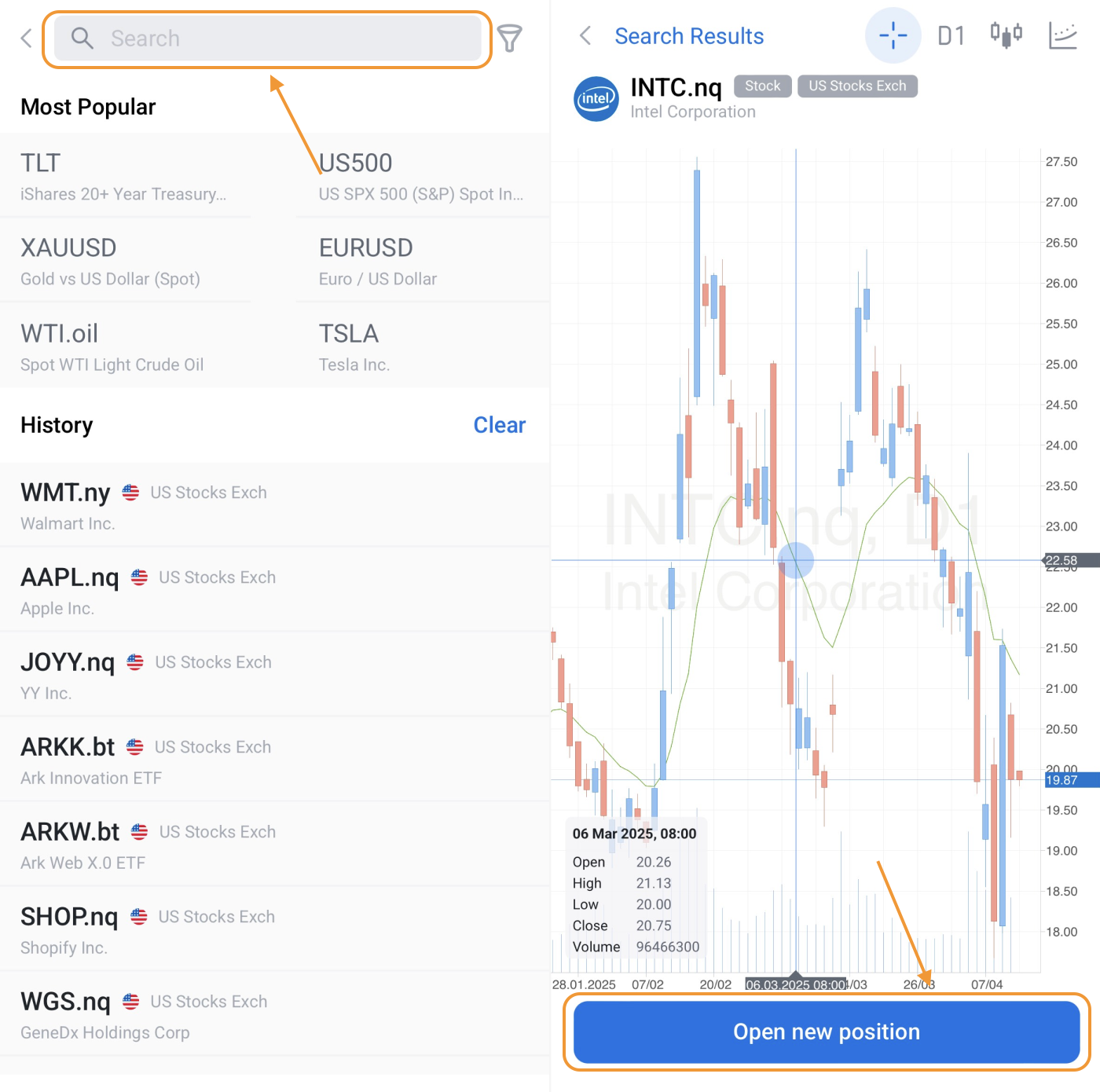 To open a new position (sell or buy), open the instrument you are interested in. Learn how to find the instrument here. Tap on "Open New Position."