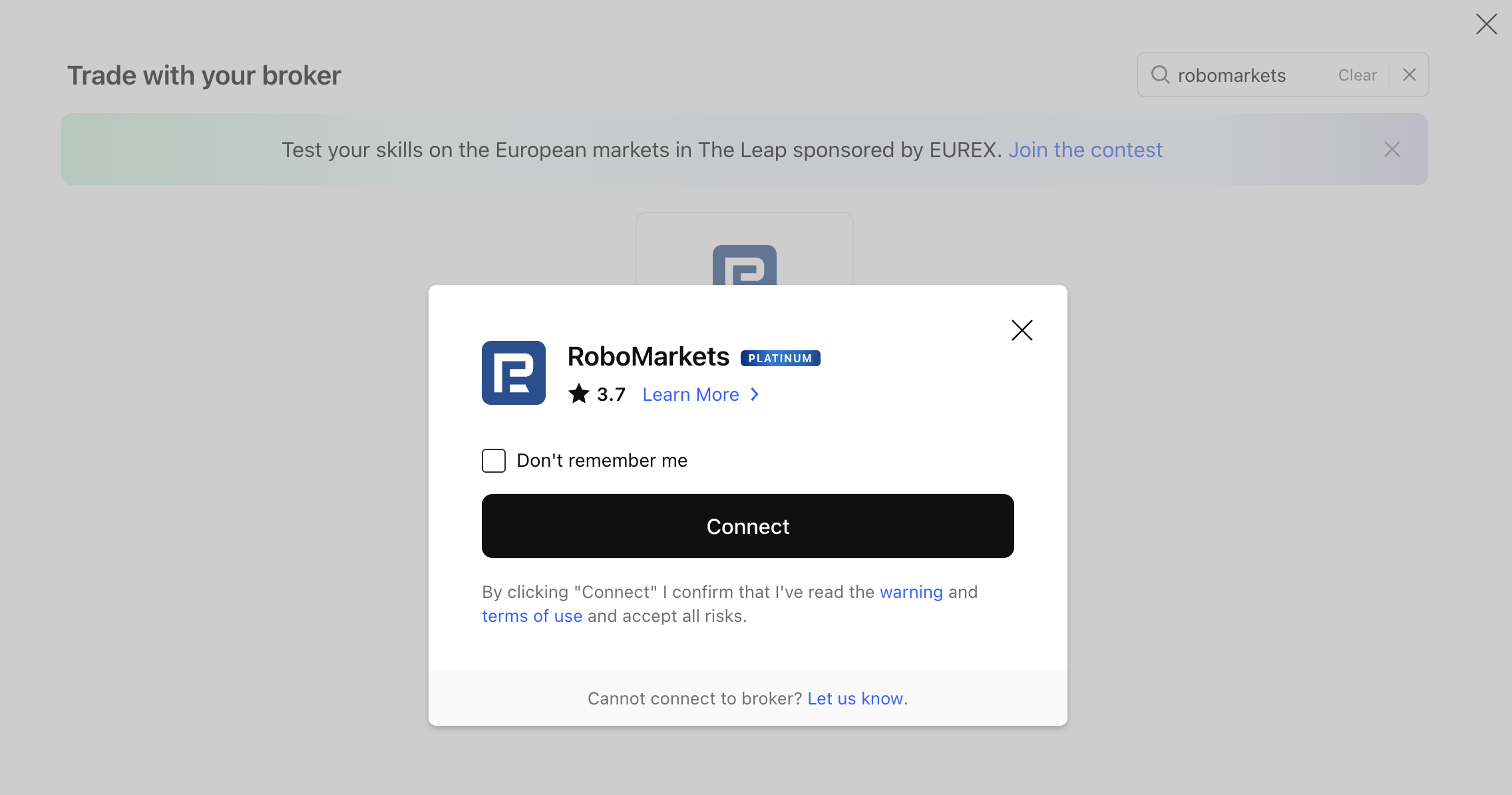 1. Go to TradingView. Open TradingView, click the "Trade" button, and select RoboMarkets as your broker in the pop-up window.