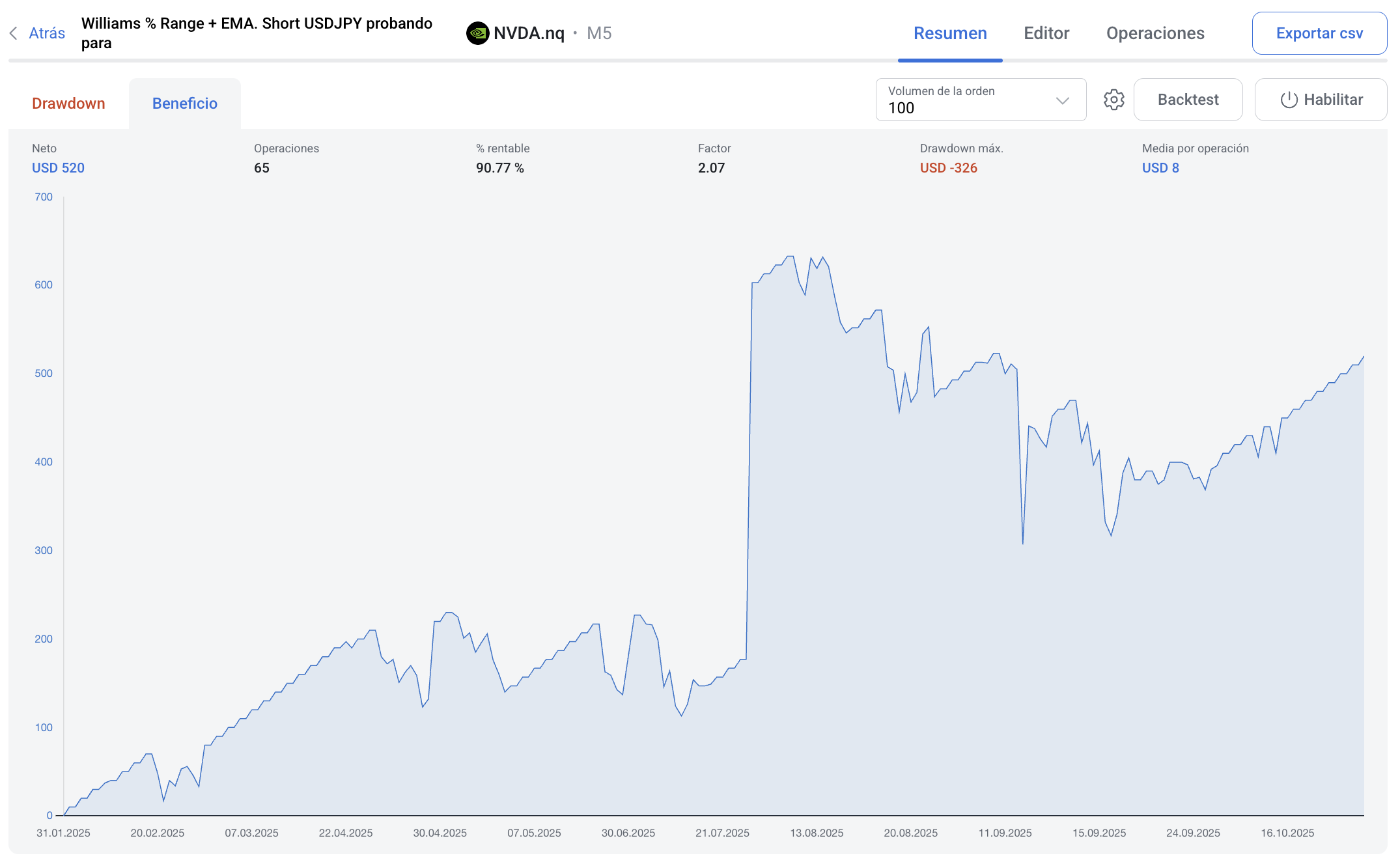 - Operaciones: Número total de operaciones ejecutadas con la estrategia en cuestión durante el período de prueba.