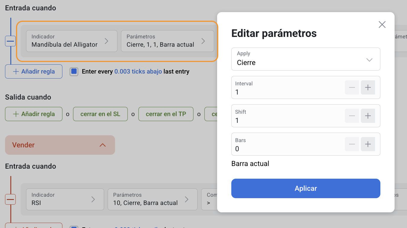 Dado que el indicador Alligator de Williams consta de tres componentes separados (Mandíbula del Alligator, Dientes del Alligator, Labios del Alligator), cada uno de los cuales tiene sus propios parámetros y valores, en el Constructor de Estrategias el Cocodrilo de Williams también se divide en tres indicadores:
