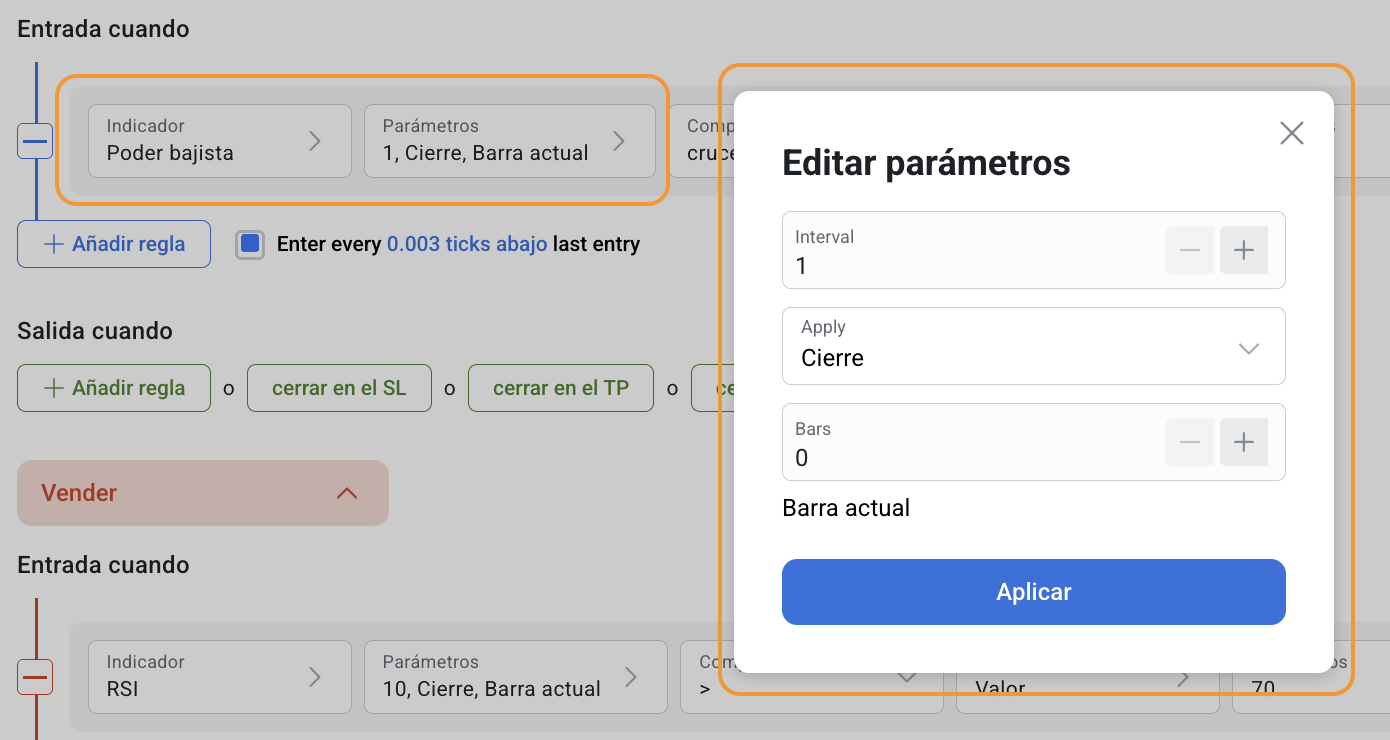 Dado que el indicador Poder Bajista y Alcista consta de dos componentes separados (Poder bajista y Poder alcista), cada uno de los cuales tiene sus propios parámetros y valores, en el RoboBuilder, el Poder Bajista y Alcista también se divide en dos indicadores: