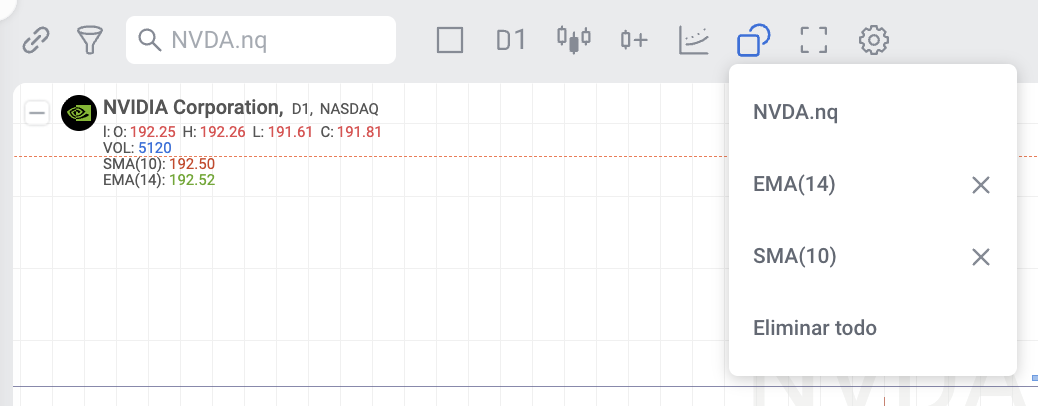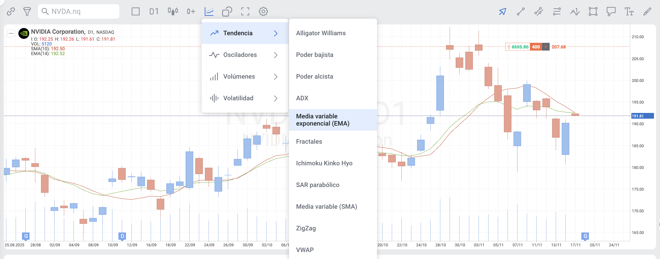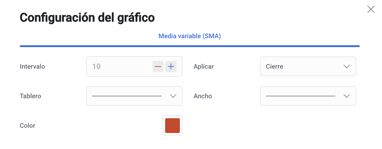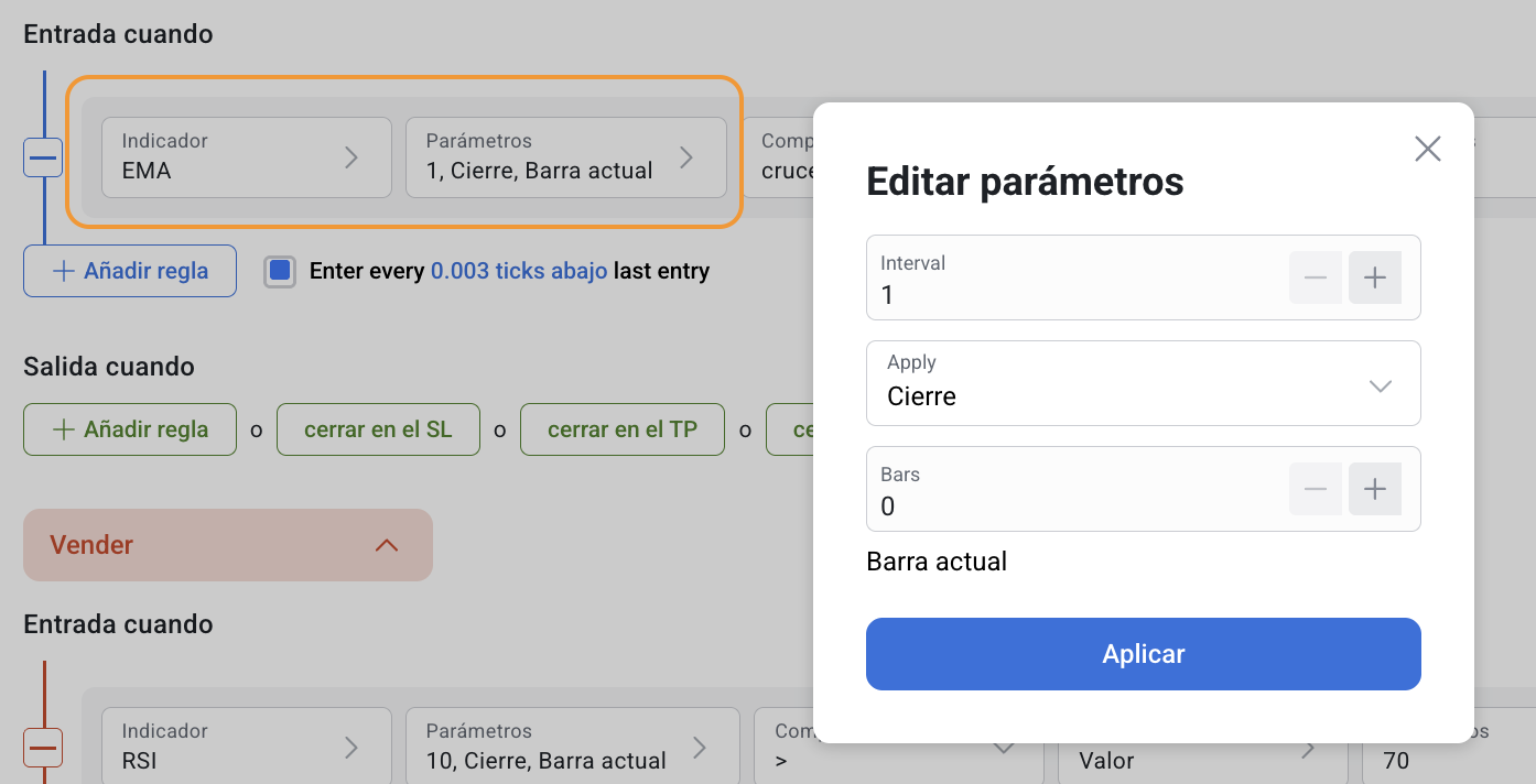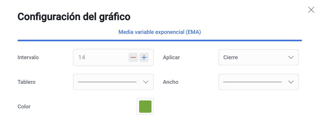 El promedio móvil (EMA, SMA) se puede utilizar tanto de forma separada como conjunta con otros indicadores en el Constructo de Estrategias.