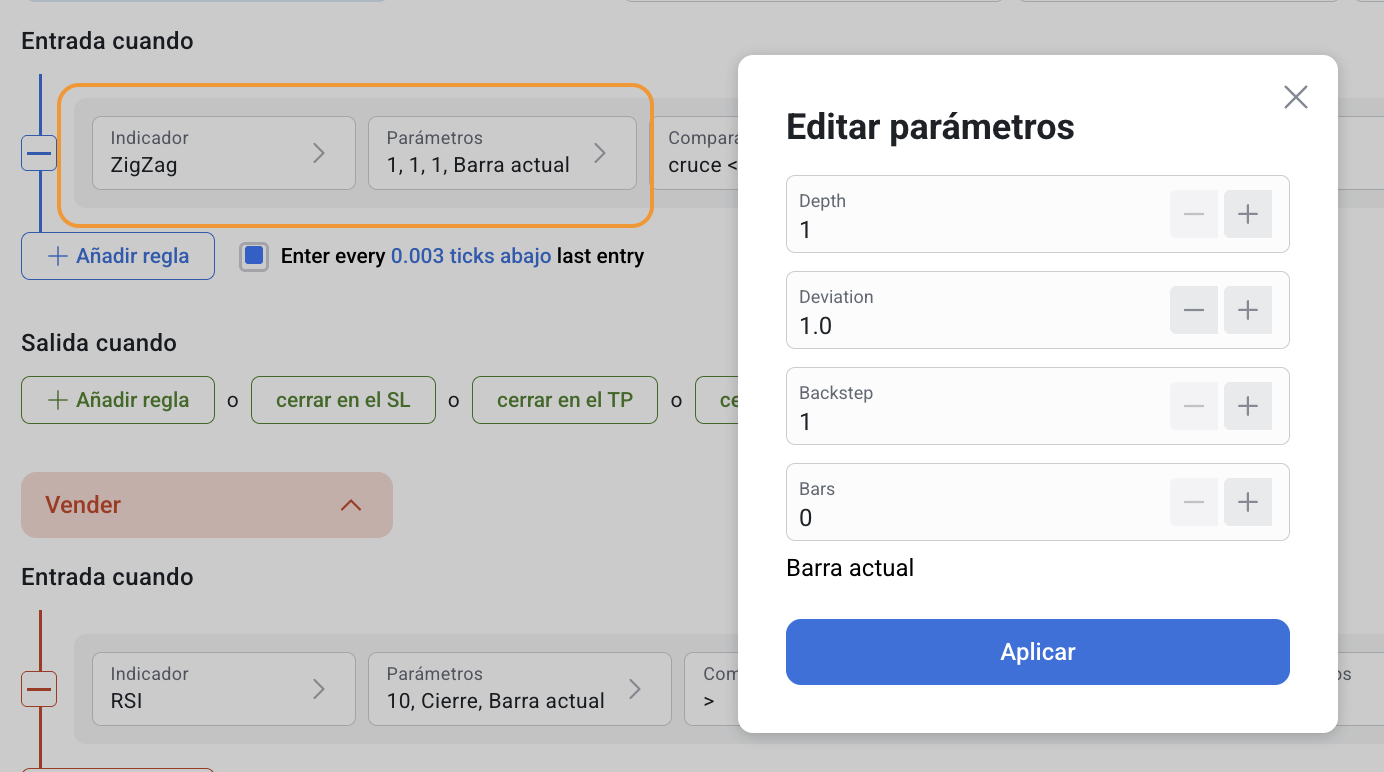 El ZigZag se puede utilizar tanto por separado como junto con otros indicadores en el Constructor de Estrategias.