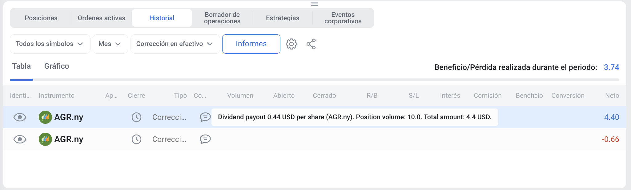 - Un cliente que mantenga una posición larga en la fecha ex-dividendo recibirá el dividendo correspondiente en forma de un ajuste en efectivo acreditado en la cuenta de trading correspondiente. Encuentre la transacción en la pestaña Historial, en la plataforma de trading del cliente en "Correcciones en efectivo".
