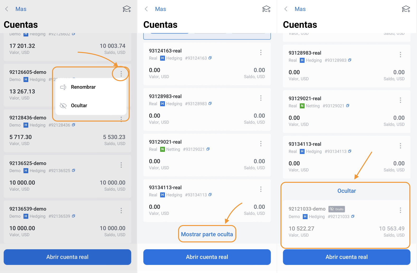 Para gestionar sus cuentas directamente en la aplicación, vaya a Mas > Cuentas > Gestionar cuentas. Allí verá todas sus cuentas reales y demo actuales.