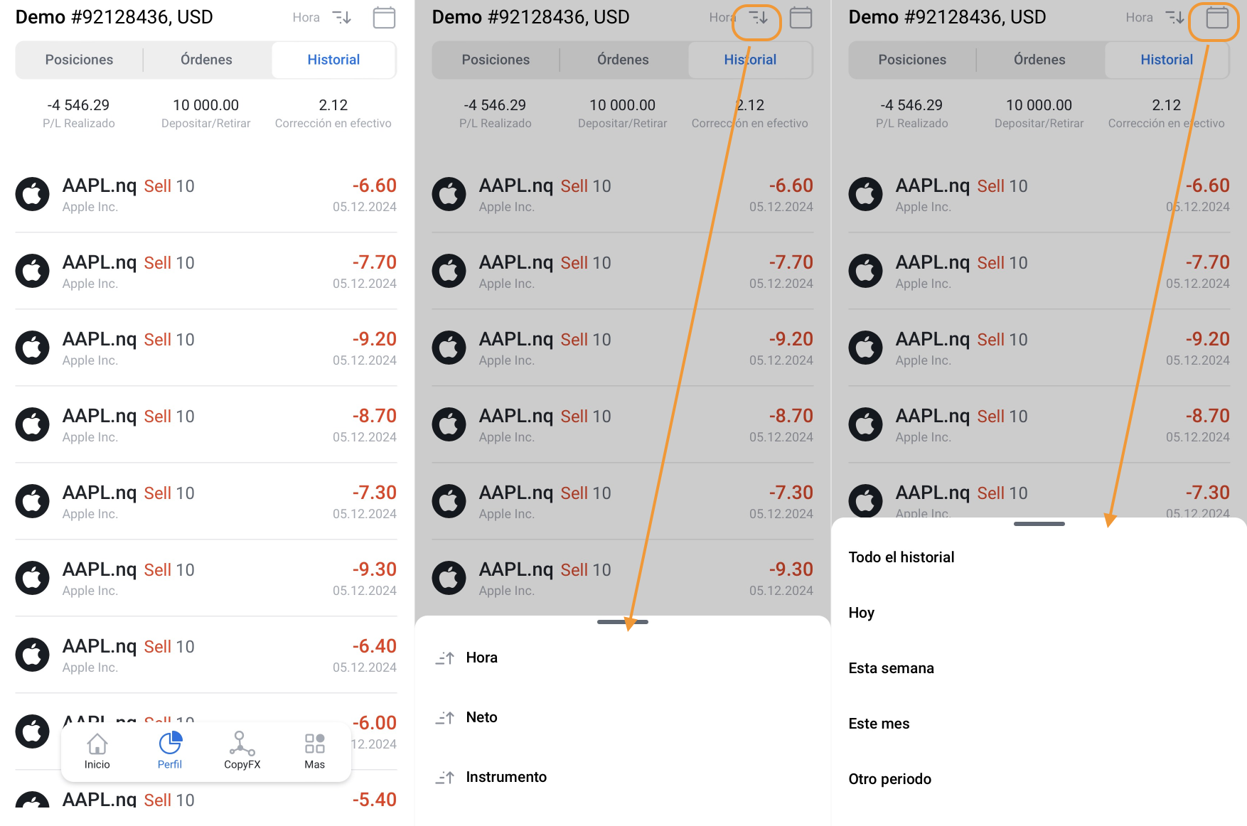 En el Historial encontrará detalles sobre el B/P Realizado, Depósitos/Retiros y Corrección de Efectivo. Además, incluye información sobre dividendos recibidos y correcciones fiscales. Puede agrupar esta información por hora, neto e instrumento. También puede elegir un período específico (todo el historial, hoy, esta semana, este mes o un período personalizado).