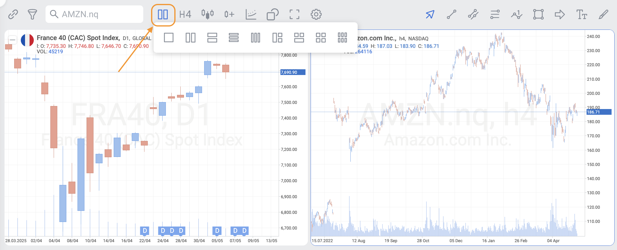 Para eliminar una ventana de gráfico y cambiar la visualización de los gráficos en la terminal web StocksTrader, haga clic en el botón "Diseño de gráficos" ubicado encima del gráfico, a la derecha de la barra de búsqueda, y elija el diseño deseado.