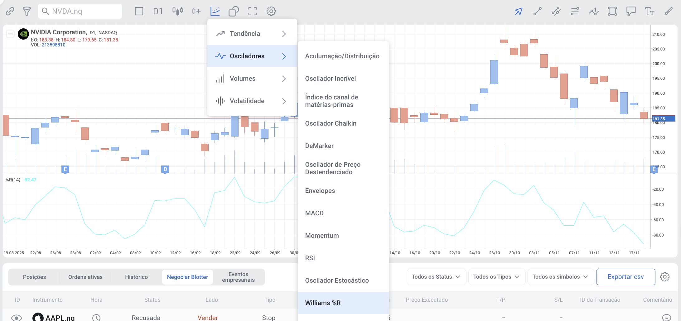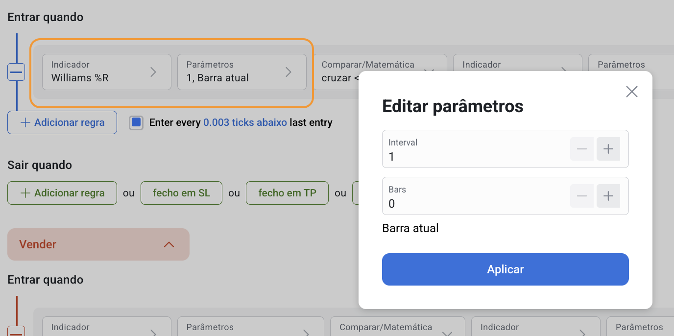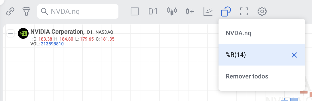 O Williams %R pode ser utilizado separadamente e em conjunto com outros indicadores no RoboBuilder.