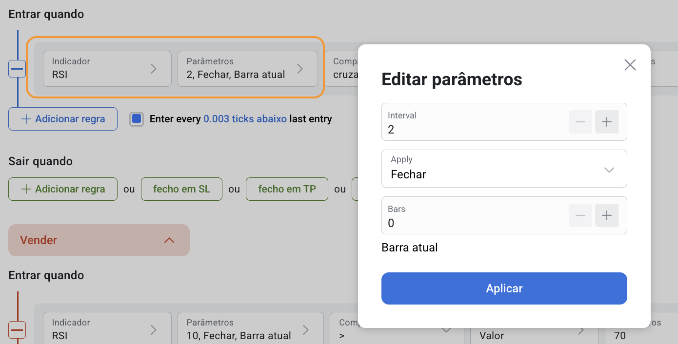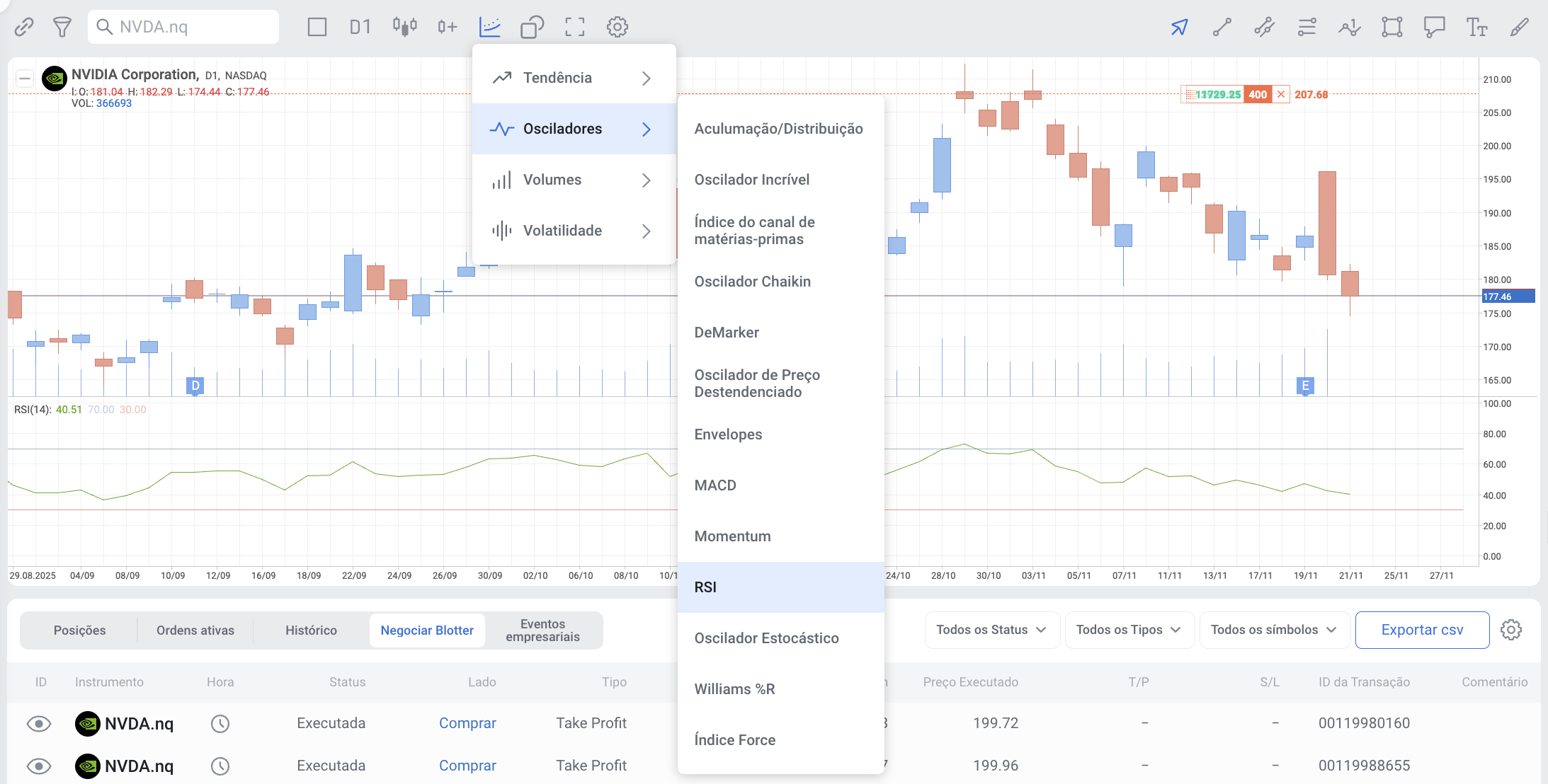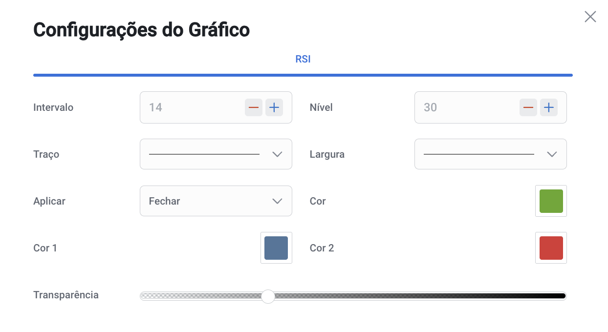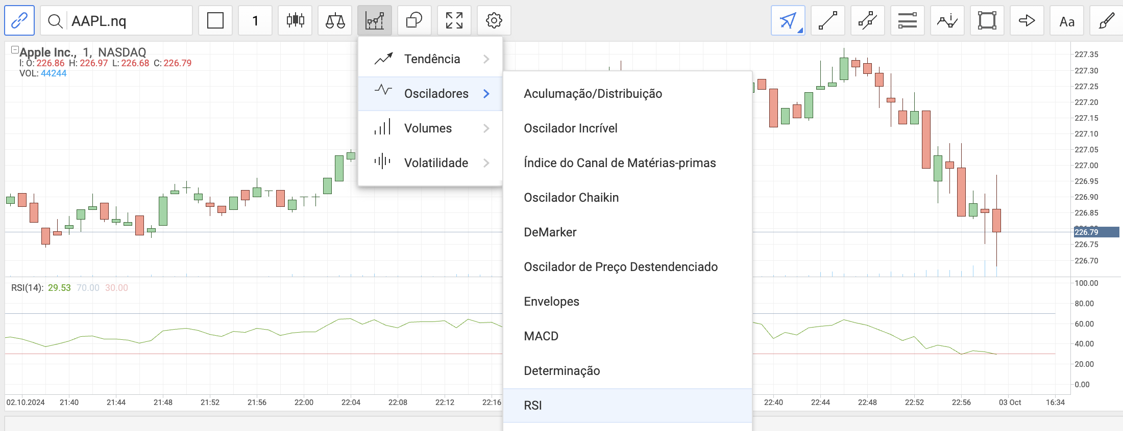 O Índice de Força Relativa (RSI) pode ser utilizado separadamente e em conjunto com outros indicadores no RoboBuilder.