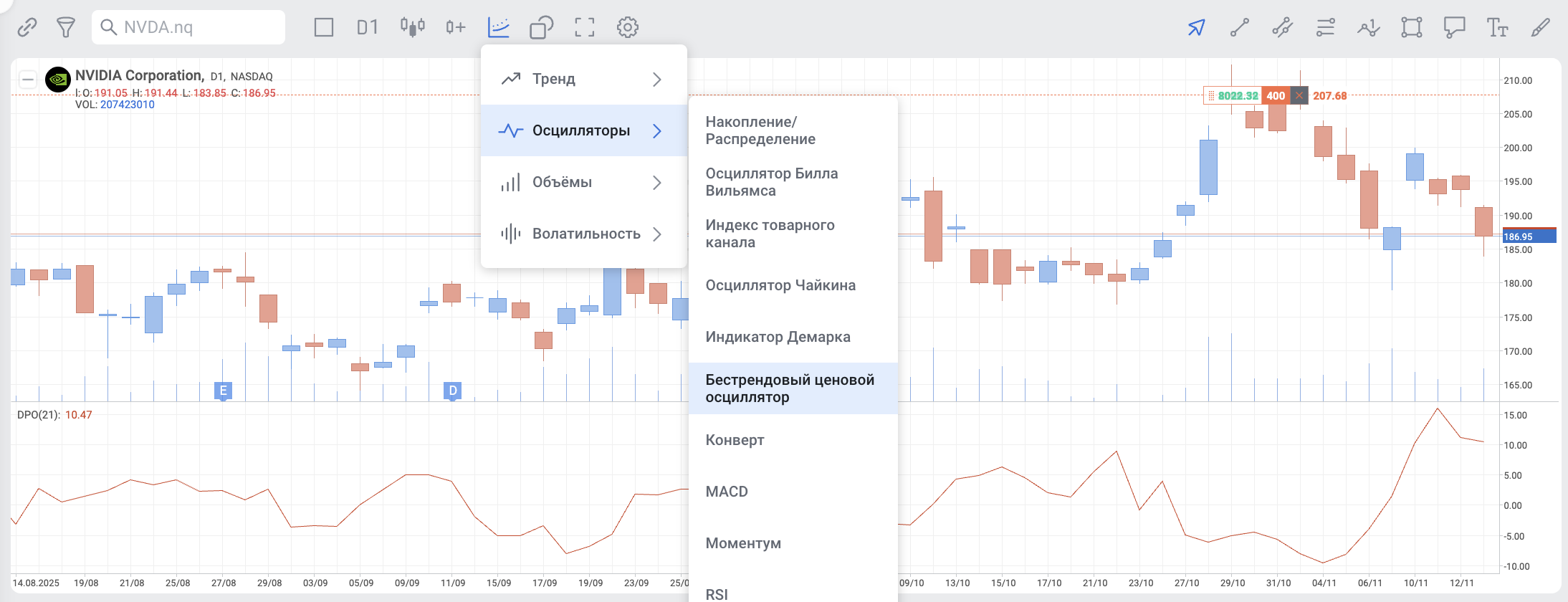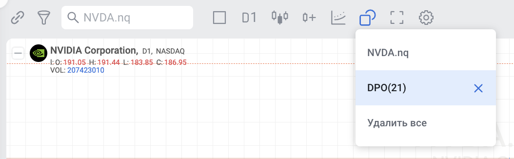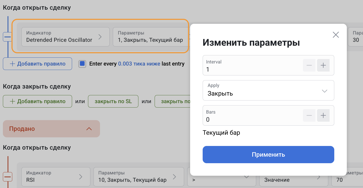 Detrended Price Oscillator (DPO) может использоваться как самостоятельно, так и вместе с другими индикаторами в конструкторе стратегий (RoboBuilder).