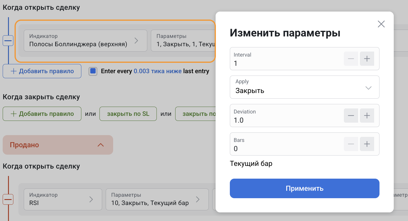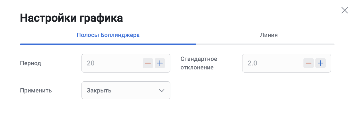 Поскольку индикатор Bollinger Bands (Полосы Боллинджера) состоит из двух самостоятельных компонентов (Bollinger Bands High, Bollinger Bands Low), каждый из которых имеет свои параметры и значения, в настройках конструктора Bollinger Bands (Полосы Боллинджера) так же разделёны на две составляющих: