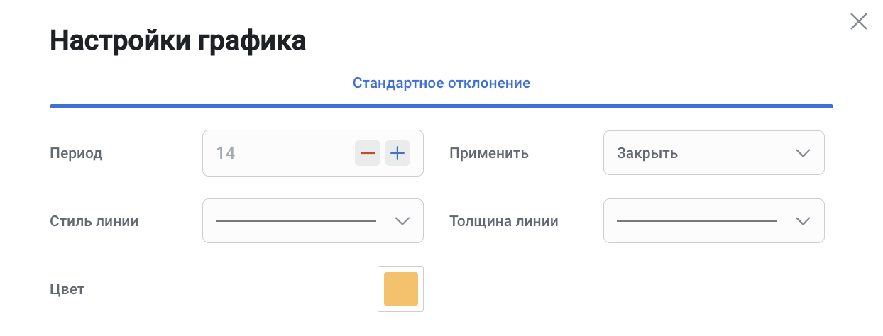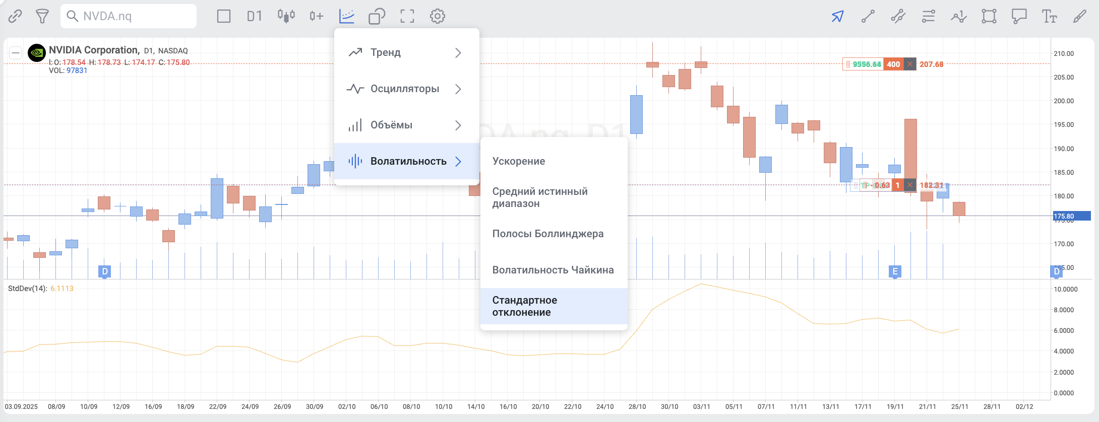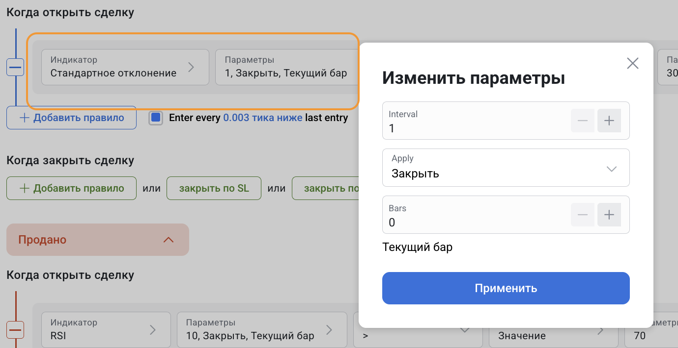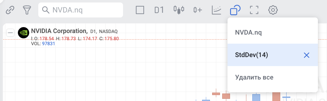 Standard Deviation (Стандартное отклонение) может использоваться как самостоятельно, так и вместе с другими индикаторами в конструкторе стратегий.